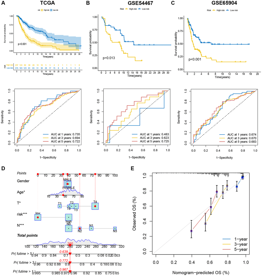 The accuracy of risk score for forecasting survival for SKCM patients was assessed using KM curves and area under curves (AUC). The survival analysis results for training cohort from TCGA showed that low-risk patients had more favorable outcomes (p < 0.001), with the 1-, 3-, and 5-year AUC values being 0.735, 0.694, and 0.722, respectively (Figure 6A). The results for two validation cohorts, GSE54467 (Figure 6B, p = 0.013, 1-year AUC = 0.483, 3-year AUC = 0.623, 5-year AUC = 0.725) and GSE65904 (Figure 6C, p < 0.001, 1-year AUC = 0.674, 3-year AUC = 0.670, 5-year AUC = 0.683), revealed that a low risk score was associated with significantly prolonged survival than a high-risk score. These results illustrated that SKCM patients’ survival could be predicted using the risk score. Meanwhile, a nomogram was constructed by integrating risk score and clinical information, as age, gender and tumor stage, to predict 1-, 3- and 5-year survival time (Figure 6D). The calibration curve showed that nomogram model predicted survival well based on the closeness of anticipated and observed OS values (Figure 6E).