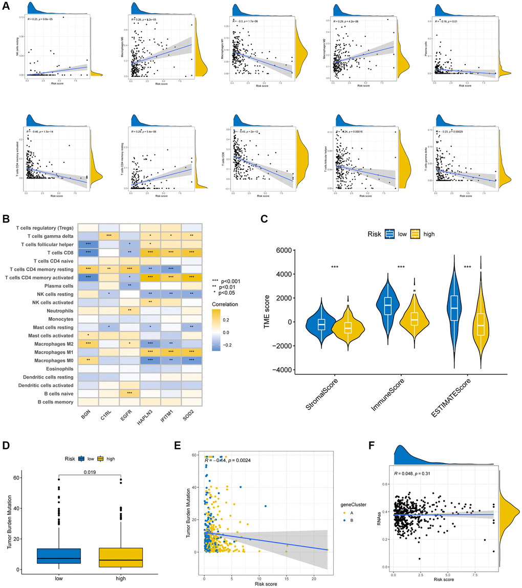 After identifying the high- and low- risk groups, we also performed some bioinformatics analysis to verify the accuracy of our risk scores. The correlation between risk scores and infiltrate immunological cells was shown in some scatter plots (Figure 7A) which demonstrated the risk score was negatively correlated with M1 macrophages, activated memory CD4 + T cells and CD8 + T cells. The association between the six prognostic genes and immune cell abundance is exhibited in Figure 7B. Significant associations were found between most immune cells and the six signature genes. Moreover, there was a strong correlation across a low-risk score and a high immunological score. (Figure 7C).