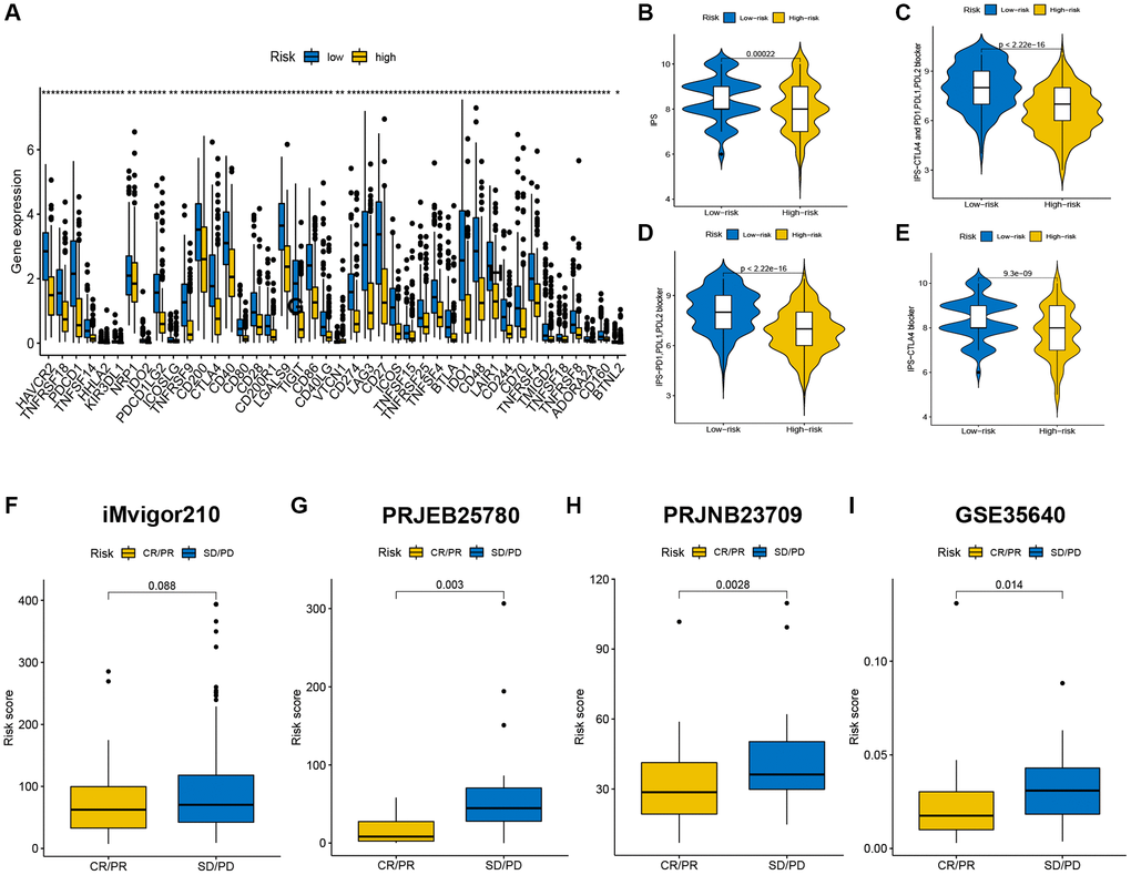 Differences in immune checkpoint gene expression and immunological cell proportion score (IPS) between the high- and low-risk groups