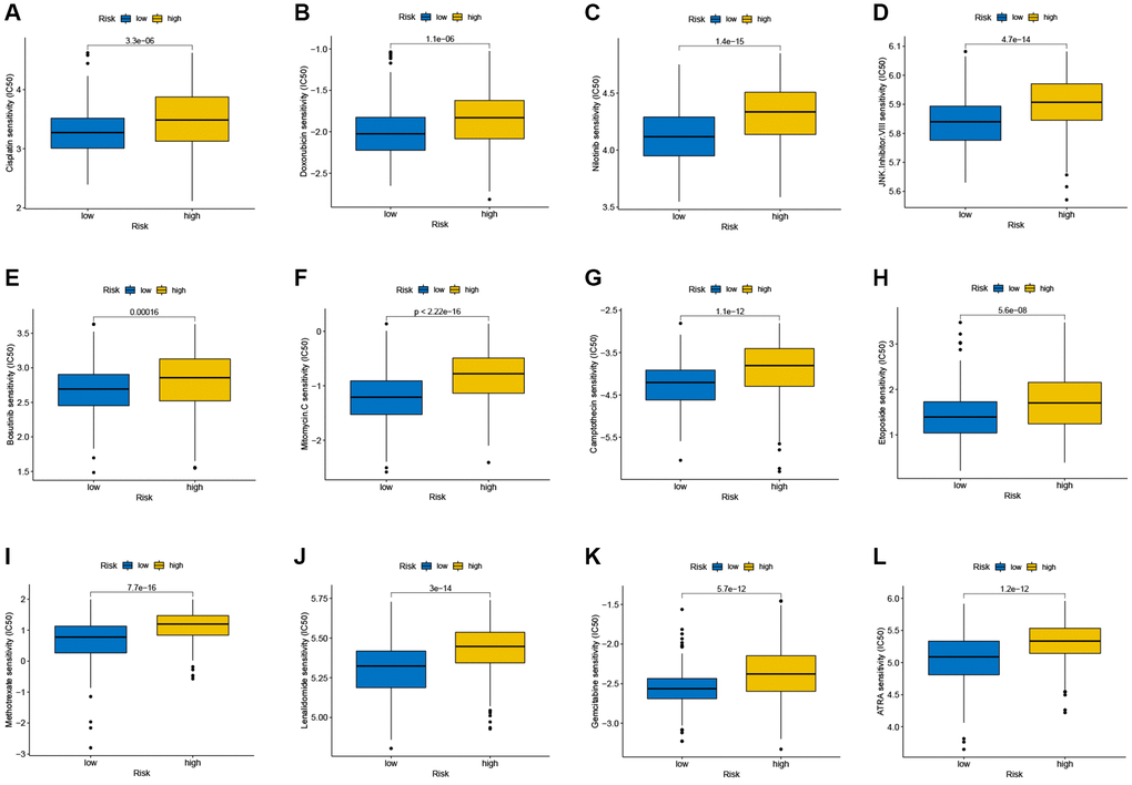 The susceptibility of tumors to some chemotherapy drugs was compared between 2 groups. The results revealed that high-risk SKCM patients had greater IC50 values for cisplatin, doxorubicin, nilotinib and so on, suggesting that TRG is associated with drug susceptibility (Figure 9A–9L).