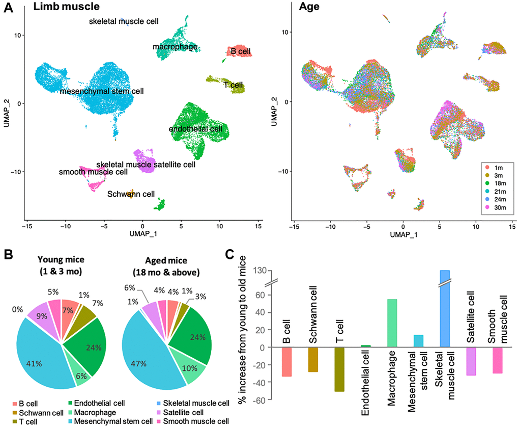 Skeletal muscles are composed of various cell types, including myocytes, mesenchymal stem cells, endothelial cells, smooth muscle cells, muscle satellite cells, neuronal cells, and immune cells. To determine which cells in skeletal muscle are more susceptible to the aging process, we used Tabula Muris Senis, a single cell RNA sequence (scRNA-sequence) data from 1-, 3-, 18-, 21-, 24-, and 30-month-old mice (Figure 1A) [18]. The data contained all cell types that limb muscle tissue should have, as described above. However, the number of skeletal muscle cells was strikingly low in the dataset, which may be due to loss in the process of preparing single cells. Although the detailed protocol includes a process of digestion and filtration sufficient to yield mononuclear cells, skeletal muscle cells are multinucleated in nature and were probably lost in this process [18, 19]. Therefore, the data is not suitable for analysis of skeletal muscle cells, but contains a large and representative number of other cell types and would be powerful for comprehensive analysis. To identify age-related changes, we first compared the proportions of each cell type in young (1 and 3 mo. old) and aged (≥18 mo.) mice, as one simple indicator (Figure 1B). The definition of aged mice was derived from previously published work [20, 21]. Aside from skeletal muscle (again, the marked increase in skeletal muscle ratio is only due to the change from 0% to 1%), most cell proportional changes were within a 50% increase or decrease. In aged mice, the ratios of B cells, Schwann cells, T cells, satellite cells, and smooth muscle cells decreased, while the ratio of macrophages increased (Figure 1C). Ratios of endothelial cells and mesenchymal stem cells did not alter significantly. If skeletal muscle cells are excluded from data interpretation for the reasons indicated above, the most significant changes would be seen in immune cells, namely B cells, T cells, and macrophages. Acquired immune system cells, represented by B and T cells, were abundant in young mice, whereas innate immune system cells, represented by macrophages, were enriched with age. These alterations in immune cells are known as immune senescence, which is associated with muscle dysfunction such as sarcopenia [22].