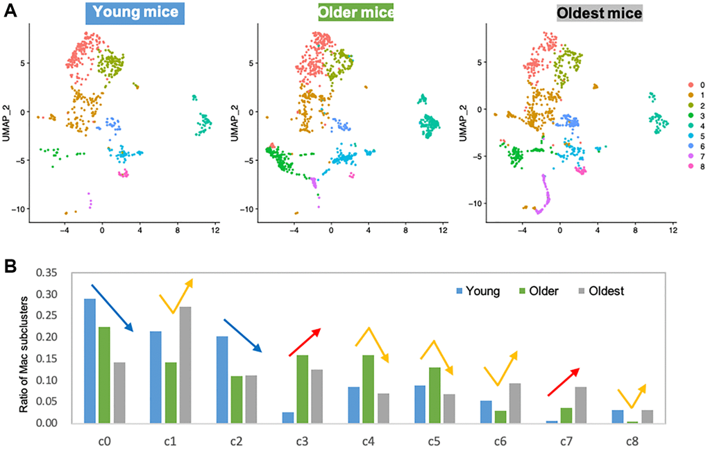 Macrophage clusters (clusters 4, 17, and 18) were subset and subclustered by recalculating resolutions at 0.3. Subclustered macrophages were classified into three age groups for further analysis: young (1 and 3 months), older (18 and 21 months), and oldest (24 and 30 months). Characteristics of the macrophage subclusters were compared using differentially expressed genes identified by the FindMarkers function. Marker genes for each subcluster were subjected to Gene Ontology (GO) analysis using Metascape (https://metascape.org/gp/index.html#/main/step1).