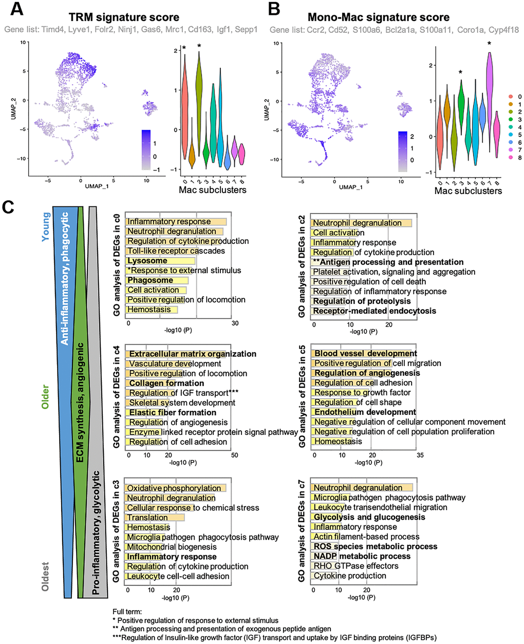 In skeletal muscle, macrophages are known to play important roles in tissue homeostasis, repair, immunity, and pathophysiology [23, 24]. Alterations of macrophage profiles have been described in skeletal muscle of aged mice. Specifically, a study demonstrated that muscle regrowth in aged mice is impaired compared to young mice, and was characterized by macrophage polarization patterns and specific macrophage abundance [17]. Interaction between macrophages and muscle stem cell population was established by Wang et al. when they demonstrated that transplantation of young mice bone-marrow derived cells into aged mice prevented sarcopenia and age-related shifts in muscle fiber phenotype [10]. Thus, we hypothesized that the increase in certain macrophage population with aging is a contributor to functional decline in skeletal muscle. Macrophages phenotypes are highly diverse, with dynamic changes in response to the microenvironment. To examine the diverse phenotypic changes in macrophages with age, macrophage populations in the scRNA-seq data were sub-clustered and classified into nine clusters (Figure 2A and Supplementary Figure 1). Anti-inflammatory M2-type macrophage markers were enriched in subclusters 0 and 2 (Supplementary Figure 2A), whereas pro-inflammatory M1-type macrophage markers were evenly distributed (Supplementary Figure 2B). Age-wise representation of M2/M1-type macrophage signature score indicated that M2-macrophages tend to decrease as aging (Supplementary Figure 2C). However, M1-macrophage markers were consistent across the ages, suggesting that the typical classification of M1 and M2 types are not enough to interpret the data (Supplementary Figure 2D). Instead of classifying macrophage subtypes into M1 and M2 types, other approach for categorizing them is whether they are tissue resident macrophages (TRMs) or are monocyte-derived macrophages [16, 25]. This classification reflects their origins and functions. TRMs derived from erythromyeloid progenitors have a high capacity of self-renewal and so reside at the same location for a long time [25]. On the other hand, hematopoietic stem cells give rise to monocyte-derived macrophages. They are short-lived and are constantly replaced by circulating monocytes [25]. In some tissues, it has been observed that TRMs undergo apoptosis when inflammation occurs and monocyte-derived macrophages replace them [14]. A recent study revealed the core gene sets that represent either TRMs or monocyte-derived macrophages that are common across life time and in multiple organs including skeletal muscle [25]. In our analysis of tissue macrophages in skeletal muscles, when divided into young mice (1 and 3 mo. old), older mice (18 and 21 mo. old), and oldest mice (24 and 30 mo. old), there is a clear trend of age- related decrease or increase in numerous subclusters. Subclusters 0 and 2 decreased with age, while subclusters 3 and 7 increased with age (Figure 2B, blue and red arrows). These age-related decreasing/increasing trends were surprisingly concordant with TRM/monocyte-derived macrophage enrichment (Figure 3A, 3B). Further, gene ontology (GO) analysis was performed on differentially expressed genes (DEGs) of subclusters 0, 2, 4, 5, 3, and 7, which showed most remarkable decrease or increase with aging (Figure 3C). Macrophages in subclusters 0 and 2 (c0 and c2) were significantly enriched in the phagocytic phenotype, typical of an M2-like population (Figure 3C, upper two). Macrophages in subclusters 4 and 5 (c4 and c5) seemed to be involved in the extracellular matrix (ECM) formation and angiogenesis (Figure 3C, middle two). On the other hand, macrophages in subclusters 3 and 7 (c3 and c7), an oldest mice-specific population, were abundant in metabolic signatures such as glycolytic and oxidative stress-induced metabolic process (Figure 3C, lower two).