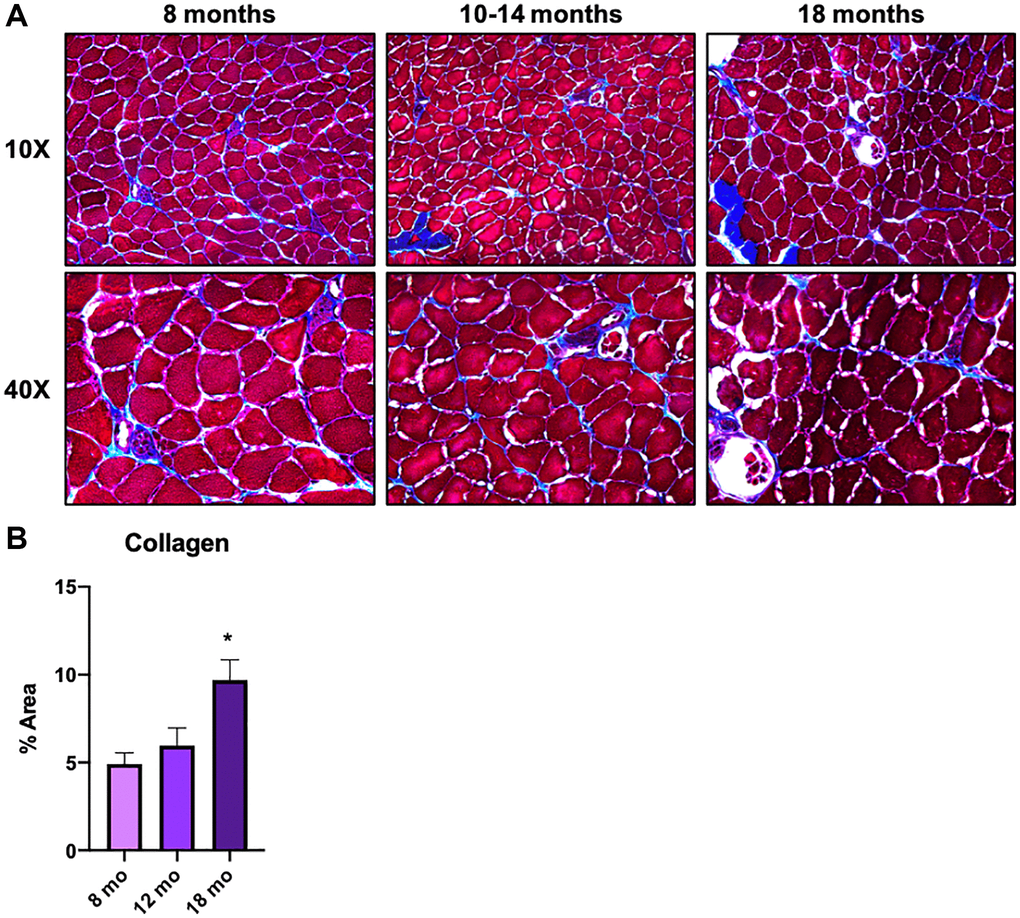 In the previous section, we examined macrophages that decrease or increase with age, while several macrophage subclusters showed specific proportional characteristics in older animals (18 and 21 mo. old), namely subclusters 1, 4, 5, 6, and 8 (Figure 2B, yellow arrows). From a clinically translatable perspective, changes in the tissues of older animals are important to enable early intervention. In fact, sarcopenia, a multifactorial syndrome of age-related loss of skeletal muscle mass and function, has been reported to begin in humans in approximately their 30 s [5]. Therefore, we again performed GO analysis on the differentially expressed genes in subclusters 4 and 5, which showed a pronounced increase only in older mice (18 and 21 mo. old), to understand their significance. Both subclusters included terms that related to vascular development and angiogenesis (Figure 3C, middle two). On the other hand, subclusters 1, 6, and 8, were strikingly enriched with ribosomal genes and overall were downregulated in the older groups (Supplementary Figure 3). The results for subcluster 4 are of particular interest due to the abundance of terms related to ECM formation. It is widely known that ECM of skeletal muscle is involved in mechanical functions, muscle repair and regeneration [26]. Excess or altered formation of ECM in aged muscles is known to contribute to tissue fibrosis, resulting in increased mechanical stiffness and decreased physical activity [27, 28]. Although studies suggest that collagen increases with age [27], others showed a decrease of collagen fiber tortuosity rather than collagen content or fiber orientation in the ECM of aged muscle [28, 29]. Further, the study reported that the age-related alteration of ECM drive muscle stem cell differentiation toward a fibrogenic lineage [28]. Our in vivo study using gastrocnemius/soleus muscles confirmed that collagen accumulation increases linearly with age and was more evident in 18-mo-old animals (Figure 4A and 4B). Taken together, the scRNA-seq data and in vivo analysis suggested a correlation between ECM remodeling, particularly collagen accumulation, and regulation by a macrophage subpopulation. As such, future research is warranted to determine if macrophage subpopulations can alter ECM remodeling and potentially serve as an early sign of muscle aging.