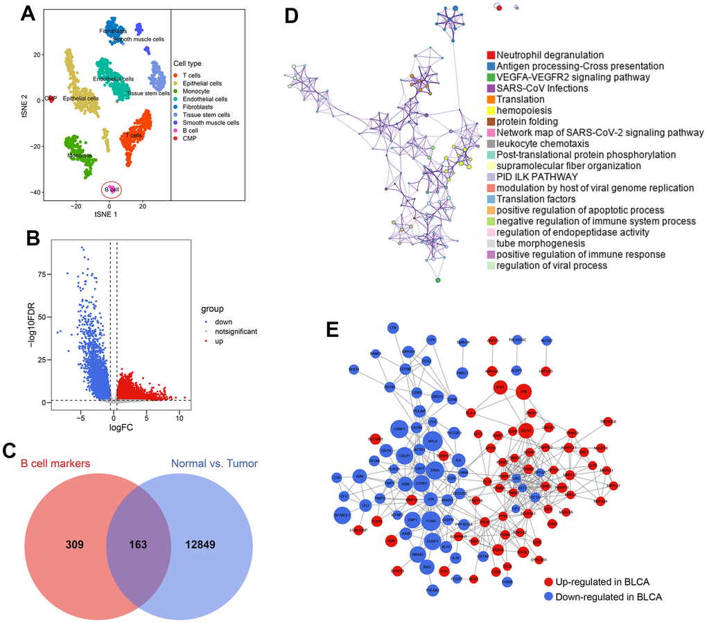 2075 cell samples extracted from a BLCA patient were mainly divided into 9 cell types, which are displayed in Figure 3A. A sum of 472 cell marker genes of B cells was identified, which were differentially expressed in B cells compared with other cell types (Supplementary Table 4). At the same time, 13012 differentially expressed genes between the paracarinoma and BLCA samples were screened from the TCGA-BLCA cohort (Figure 3B and Supplementary Table 5), 163 of which also acted as B cell markers and were selected for further investigation (Figure 3C). The functional annotation indicated that the 163 genes were primarily involved in the immune and inflammatory responses (Figure 3D), agreeing with the previous findings. The PPI network of these 163 genes is shown in Figure 3E, implying the tight regulatory relationship of these genes.
