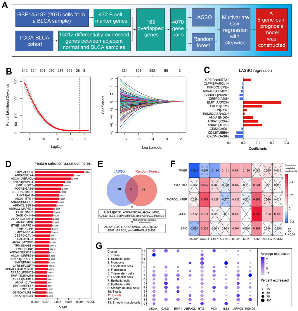 Subsequently, the 163 genes were cyclically singly paired, and 4070 gene pairs were constructed. The workflow of the predictive model construction is graphically displayed in Figure 4A. First, LASSO regression identified 16 gene pairs as the significant predictor for OS in the TCGA-BLCA cohort (Figure 4B), and their coefficients were shown in Figure 4C. Meanwhile, in the random forest analysis, 38 gene pairs were determined (Figure 4D and Supplementary Table 6). 6 gene pairs intersected with the LASSO regression results and random forest outcomes were then included in the multivariate Cox regression with stepwise (Figure 4E). Accordingly, the predictive model was constructed. BCRS was calculated as follows: BCRS = 0.548*(ANXA1|BTG1) + 0.294*(ANXA1|MDK) + 0.645*(CALD1|IL32) + 0.461*(EMP1|ARPC5) - 0.334*(ABRACL|PSMD2). A sum of 9 genes was contained in this predictive model, including ANXA1, CALD1, EMP1, ABRACL, BTG1, MDK, IL32, ARPC5, and PSMD2, almost all of which were significantly associated with B cell infiltration proportion (all P < 0.05, Figure 4F), indicating that BCRS might be associated with B cell infiltration in BLCA samples (see below for more analyses). Figure 4G shows the expression levels of these 9 genes in each cell cluster identified by the scRNA-seq analysis of the BLCA sample.