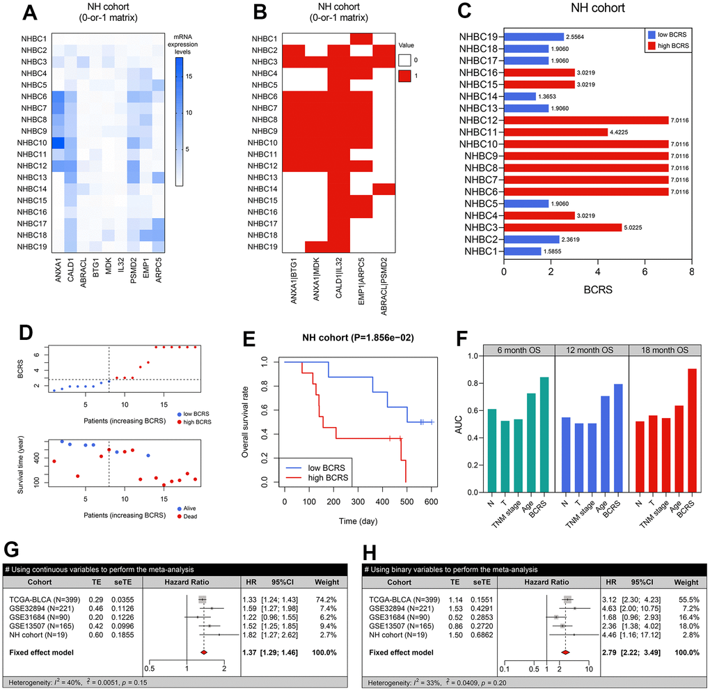 Given that the BCRS was not a significant predictor in the GSE31684 cohort (P > 0.05, Figure 5I), we performed meta-analyses to combine the effects, and the result indicated that BCRS was a significant biomarker for the OS in BLCA, no matter using the continuous variables (pooled HR = 1.37, 95%CI = 1.29-1.46, Figure 6G) and the binary variables (pooled HR = 2.79, 95%CI = 2.22-3.49, Figure 6H).