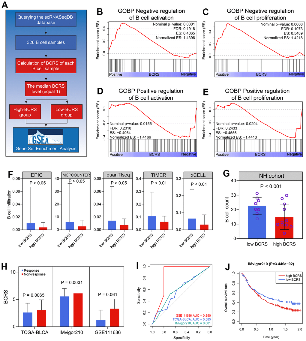 The association between BCRS and B cells’ biological processes was detected based on the 326 B cell samples extracted from the scRNAseqDB (https://bioinfo.uth.edu/scrnaseqdb/). Subsequently, GSEA was performed after the calculation of the BCRS of each B cell sample. The detailed processes are displayed in Figure 7A. Since all the BCRSs of these B cells were less than 2.75, we chose the median BCRS level (equaled 1) to classify the B cell samples into low- and high-BCRS subgroups. It was observed that the negative regulation of B cells’ activation (Nominal P < 0.05, FDR < 0.25, Figure 7B) and proliferation (Nominal P > 0.05, FDR < 0.25, Figure 7C) was enriched in the high-BCRS B cells, while the positive regulation of B cells’ activation (Nominal P < 0.05, FDR < 0.25, Figure 7D) and proliferation (Nominal P < 0.05, FDR < 0.25, Figure 7E) was significant in the low-BCRS B cells, suggesting that BCRS was negatively associated with B cells’ activation and proliferation. In the BLCA patients, the cases with high BCRS exhibited low B cell infiltration levels, both in the TCGA-BLCA cohort (Figure 7F) and the NH cohort (P < 0.001, Figure 7G).