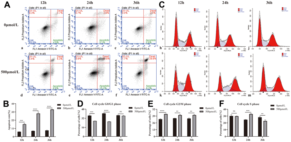 The HLEB3 cells were seeded at a density of 2×105 cells/well in 6-well plates. After allowing the cells to adhere and grow to 70-80% confluency, two groups were established: a “normal group” with no treatment, and a “model group” treated with 500μmol/L hydrogen peroxide (30%, Cas:7722-84-1, Yantai Shuangshuang, CHN) for X hours. Then cells assayed at 12, 24, and 36 hours by BD AccuriTM C6 Software (Becton, Dickinson and Company, USA). Annexin V-FITC/PI apoptosis detection kit (KGA107, KeyGEN, CHN); Cell cycle detection kit (KGA512, KeyGEN, CHN).
