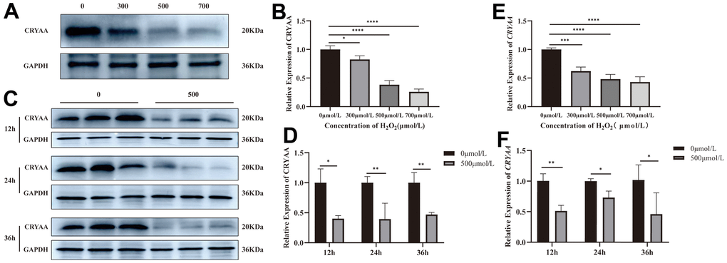Compared with the normal group, the results of CRYAA mRNA and protein expression in cells treated with 300, 500, and 700μmol/L H2O2 for 24 hours are respectively shown in Figure 2E (p value: 0.0233, <0.0001, <0.0001) and Figure 2A, 2B (p values: 0.328, 0.0005, 0.0001). Both mRNA and protein expression levels decreased. After intervention with 0 and 500μmol/L H2O2 for 12, 24, and 36 hours, the expression levels of CRYAA mRNA (Figure 2F (p values: 0.0005, <0.0001, <0.0001)) and CRYAA protein (Figure 2C, 2D (p values: 0.0046, 0.0182, 0.0452)) of 500μmol/L H2O2 group all decreased compared with the normal group. The results showed an overall decrease in the expression of the CRYAA mRNA and protein expression in HLEB3 cells after H2O2 treatment.