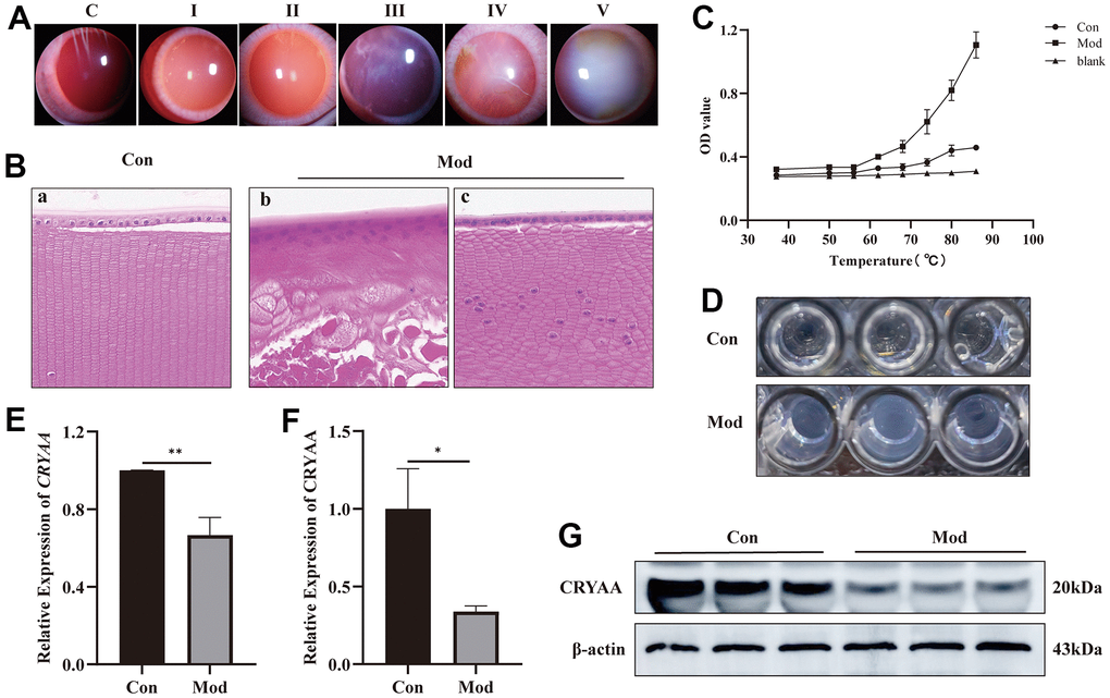 The findings revealed that whereas the OD value of the normal group continuously increased from 37° C to 86° C, the cataract group’s supernatant became increasingly cloudy at a faster rate than the normal group from 62° C to 86° C, and the trend became more pronounced as the temperature rose (Figure 3C). The supernatant of the protein at 86° C is shown in Figure 3D.