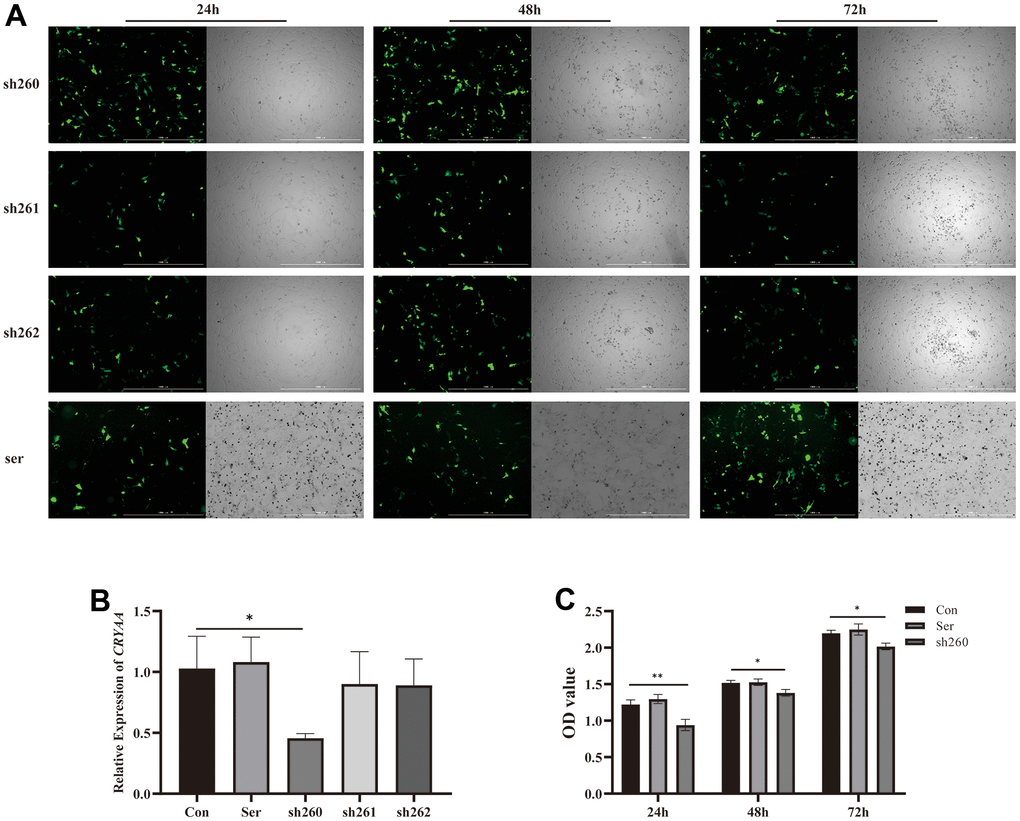 shRNA fragments of CRYAA included shRNA-260, shRNA-261, shRNA-262 and negative control (ser), were obtained from RiboBio, CHN, which can Silence the expression of CRYAA. HLEB3 cells were inoculated into 6-well plates. 24 h later, according to the transfection instructions, the cell medium was replaced with the medium containing Lipofectamine 3000 (L3000008, Invitrogen, USA) transfection reagent, corresponding shRNA and MEM, and 6 h after transfection, the medium was replaced with the complete medium. Fluorescence was taken at 24, 48 and 72 hours by cytation5 (Biotek, USA).