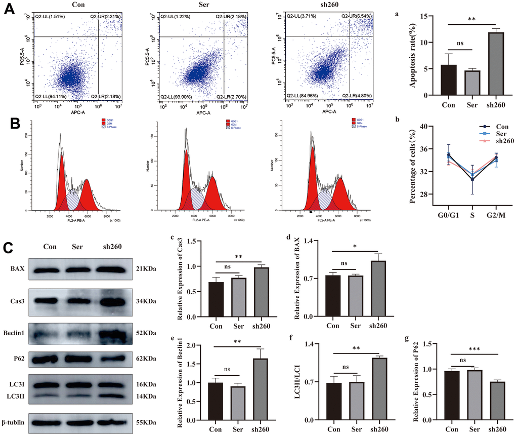 Based on the flow cytometry data, we found that silencing CRYAA had no effect cell cycle of HLEB3 cells (Figure 5B, 5b). However, it did promote cell apoptosis (Figure 5A, 5a) compared with the normal group, with statistical significance (p value: 0.0019) in the sh260 group. Additionally, depletion of CRYAA was further confirmed to promote cell apoptosis through the detection the apoptotic proteins CASP 3 and BAX (Figure 5C, 5c, 5d (p value: 0.0031, 0.0114)). Furthermore, the increase of Beclin1, the increase of LC3II/LC3I ratio and the decrease of P62 indicated that depletion of CRYAA promoted autophagy (Figure 5C, 5e, 5f, 5g (p value: 0.0059, 0.0022, 0.0009)).