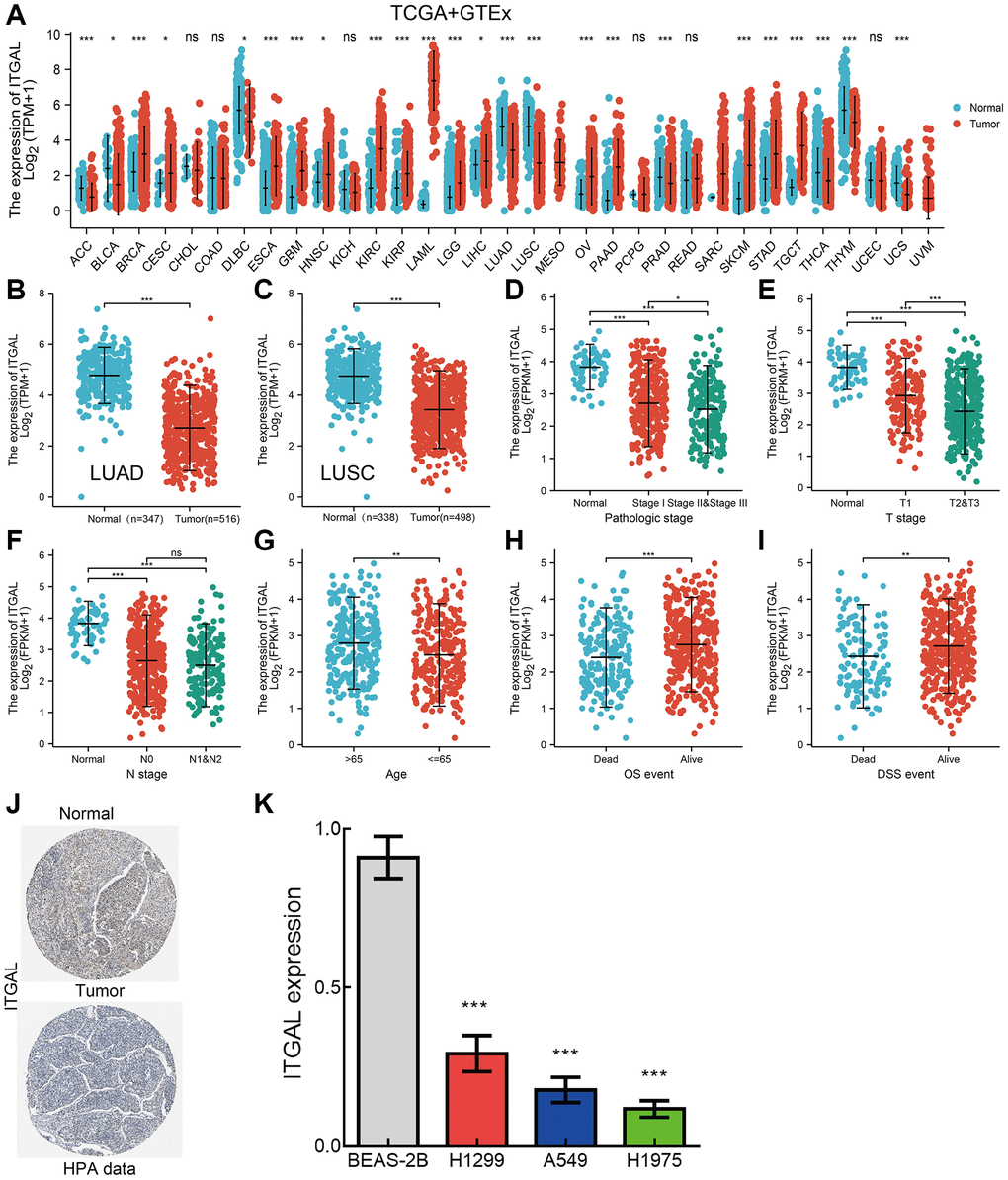 Herein, we determine the expression levels, clinical features, prognosis, and diagnostic values of ITGAL in NSCLC by TCGA-NSCLC datasets. Moreover, we evaluated its correlation with tumor immune infiltration in NSCLC by the TISIDB database and single-cell sequencing data. DNA methylation of ITGAL in NSCLC examined by Gene Set Cancer Analysis database.