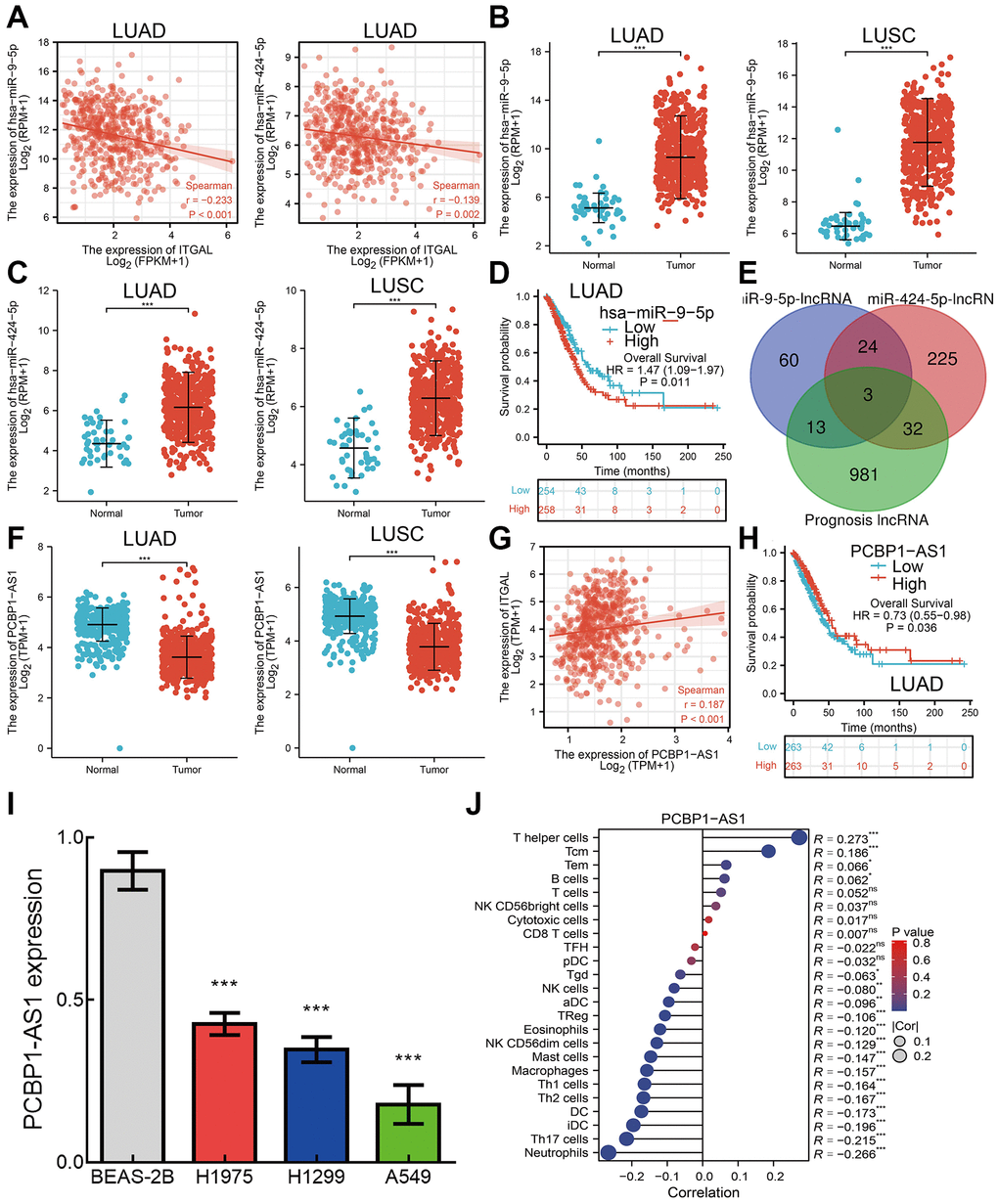 To explore the mechanism of abnormally low expression of ITGAL in lung cancer, we used multiple comprehensive analyses and successfully found that lncRNA PCBP1-A1 may be down-regulated ITGAL expression via inhibited the expression of miR-9-5p and miR-424-5. Cancer is resistant to many traditional chemotherapy drugs, and analyzing and studying the molecular mechanisms behind tumor cell resistance and exploring potential drug resistance biomarkers is crucial for cancer treatment. In this study, we comprehensively analyzed the sensitivity between ITGAL expression and different drugs, providing the relevant basis for further pharmacological analysis in the future.