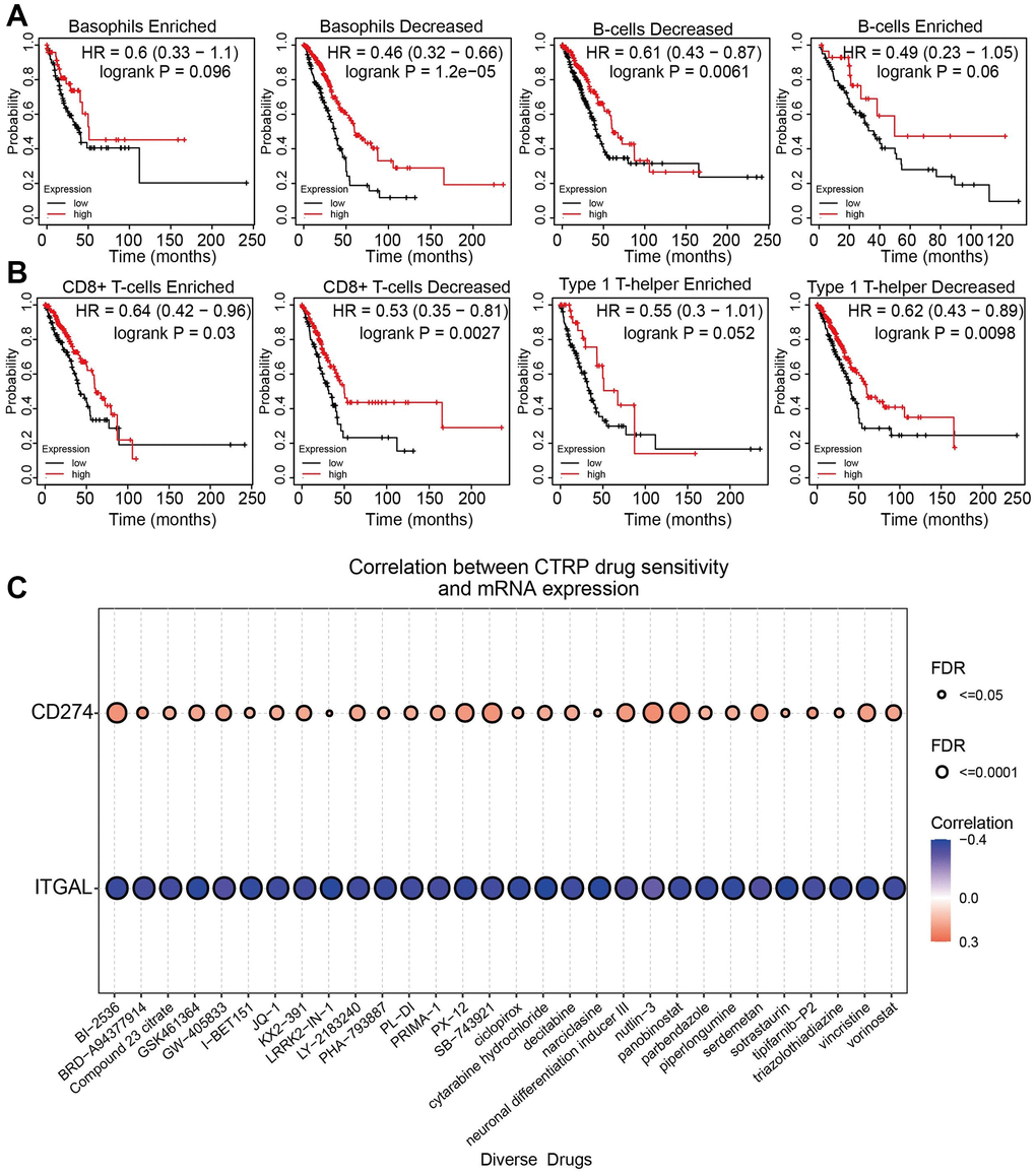 Due to the significant correlation between ITGAL and infiltration of different immune cells, we further used Kaplan-Meier plotter analyses and found that low ITGAL levels in NSCLC in decreased Basophils cohort had a worse prognosis (Figure 11A, 11B). We also examined the relationship between ITGAL expression and diverse drug sensitivity in the cancer therapeutics response portal database. We showed that ITGAL expression was negatively correlated with the sensitivity of SNX-2112, GSK-J4, Cytarabine hydrochloride, Narciclasine, LRRK2-IN-1, Teniposide, Sotrastaurin, GSK461364, BRD-K66453893, Piperlongumine AT13387, I-BET151, Ciclopirox, CR-1-31B, Vincristine, Albendazole, PX-12, Belinostat, SR-II-138A, CHM-1, Isoliquiritigenin, Triazolothiadiazine and BI-2536 (r < −4, p < 0.001) (Figure 11C). This evidence suggested that ITGAL may regulate the sensitivity of the above different drugs and promote NSCLC progress. It is necessary to employ these drugs to verify their functions at the cellular level.