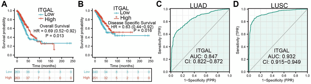 In the TCGA dataset, we found that ITGAL was down-regulated in NSCLC (Figure 1A–1C). We next explored the correlations between ITGAL level and clinical features of NSCLC patients. Results showed that low expression of ITGAL related to poor clinical features, including pathological, TN stage, age, and diverse survival events (Figure 1D–1I). Using the HPA database, we confirmed that ITGAL was significantly down in lung cancer tissue (Figure 1J). More importantly, compared to normal lung epithelial cells, ITGAL levels in lung cancer tumor cell lines are abnormally decreased (Figure 1K). Kaplan-Meier was employed to determine the prognosis of ITGAL in NSCLC. We found that patients with a lower level of ITGAL have short OS and DSS in NSCLC patients (Figure 2A, 2B). ROC curve data showed that ITGAL may be a potential diagnostic marked in NSCLC (Figure 2C, 2D).