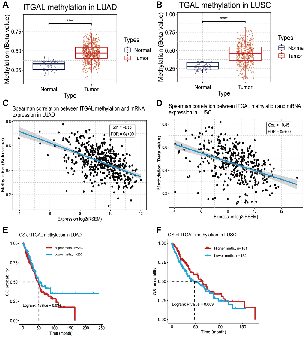 Linkedomics was used to get the genes that are positive or negative with ITGAL in NSCLC (Figure 4A, 4B). GO enrichment results confirmed that ITGAL was major involved in the immune response-related signaling pathway (Figure 4C). KEGG results indicated that ITGAL mainly participated in the T cell receptor pathway and Th17 cell differentiation (Figure 4D). DNA methylation plays an indispensable role in regulating cancer malignant progression and recurrence [19]. Hypermethylation of gene promoter regions usually results in gene expression decreased in tumors. We analysis of the correlations between DNA methylation and ITGAL in NSCLC. Results confirmed that DNA methylation of ITGAL was higher in NSCLC tissues than in normal tissues (Figure 5A, 5B). We also found a significant negative correlation between ITGAL levels and DNA methylation status (Figure 5C, 5D). However, the DNA methylation level of the ITGAL gene did not affect the prognosis of lung cancer patients (Figure 5E, 5F).