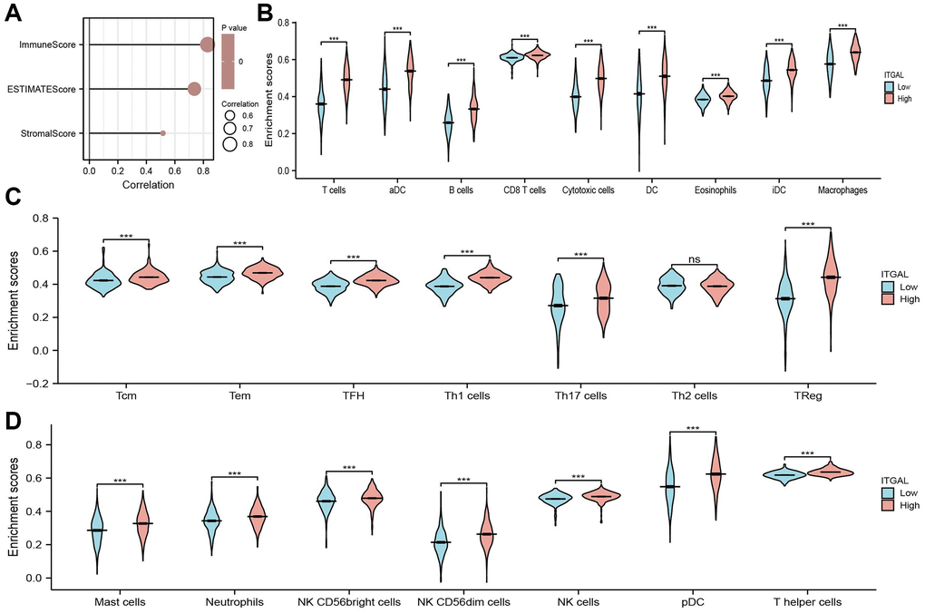 We further explore the relationship between ITGAL levels and the tumor immune microenvironment of NSCLC. First, we found that ITGAL was highly expressed in the C3 immune subtype (Figure 6A, 6B). Further study indicated that there is a positive correlation between ITGAL CNV and cytotoxic, Treg, NK, Th1, Exhausted, Central-memory, CD8-T, Macrophage, and CD4-T cells in NSCLC (Figure 6C, 6D). Next, we confirmed that ITGAL was positively related to the 23 types of immune cells (Figure 7A–7F), immune scores, stromal scores, and ESTIMATE scores in NSCLC (Figures 8A). Finally, we showed that in the ITGA-high expression group, the infiltration level of most immune cells significantly increased (Figure 8B–8D).