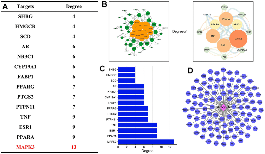 Through network pharmacology prediction combined with experiments, this work discovers that Antcin A can act on the MAPK3-NF-κB signaling pathway to exert the liver protective effect, and its mechanism is related to anti-inflammation. MAPK3 is a new target of Antcin A. Moreover, Antcin A is also an important active component in triterpenoid acid of Antrodia Camphorata, which is promising to be further investigated and translated.
