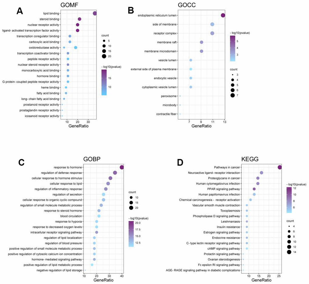 As revealed by protein-protein interaction (PPI) network construction and topology analysis, there were 100 drug targets and 3039 disease-related genes, and the intersection between these gene sets resulted in 73 intersected genes, including 14 core targets (like MAPK3). From the PPI network of drugs in treating disease, 23 related genes were obtained, with 72 interactions between targets. There were 842 biological processes (BPs) involved in the role of Antcin A in treating disease, which were related to cell responses to chemical stress, oxidative stress response, and cell responses to oxidative stress. Besides, 12 cellular components (CCs) were enriched, which were related to the transcription regulatory complex, endoplasmic reticulum lumen, and glutamatergic synaptic cell fractions. Further, 108 molecular functions (MFs) were enriched, which were related to monocarboxylic acid binding, oxidoreductase activity, and RNA polymerase II specific DNA binding transcription factor binding. In addition, 112 pathways were enriched, mainly including the C-type lectin receptor signaling pathway and the chemical carcinogenesis-reactive oxygen species signaling pathways (Figures 1–3).