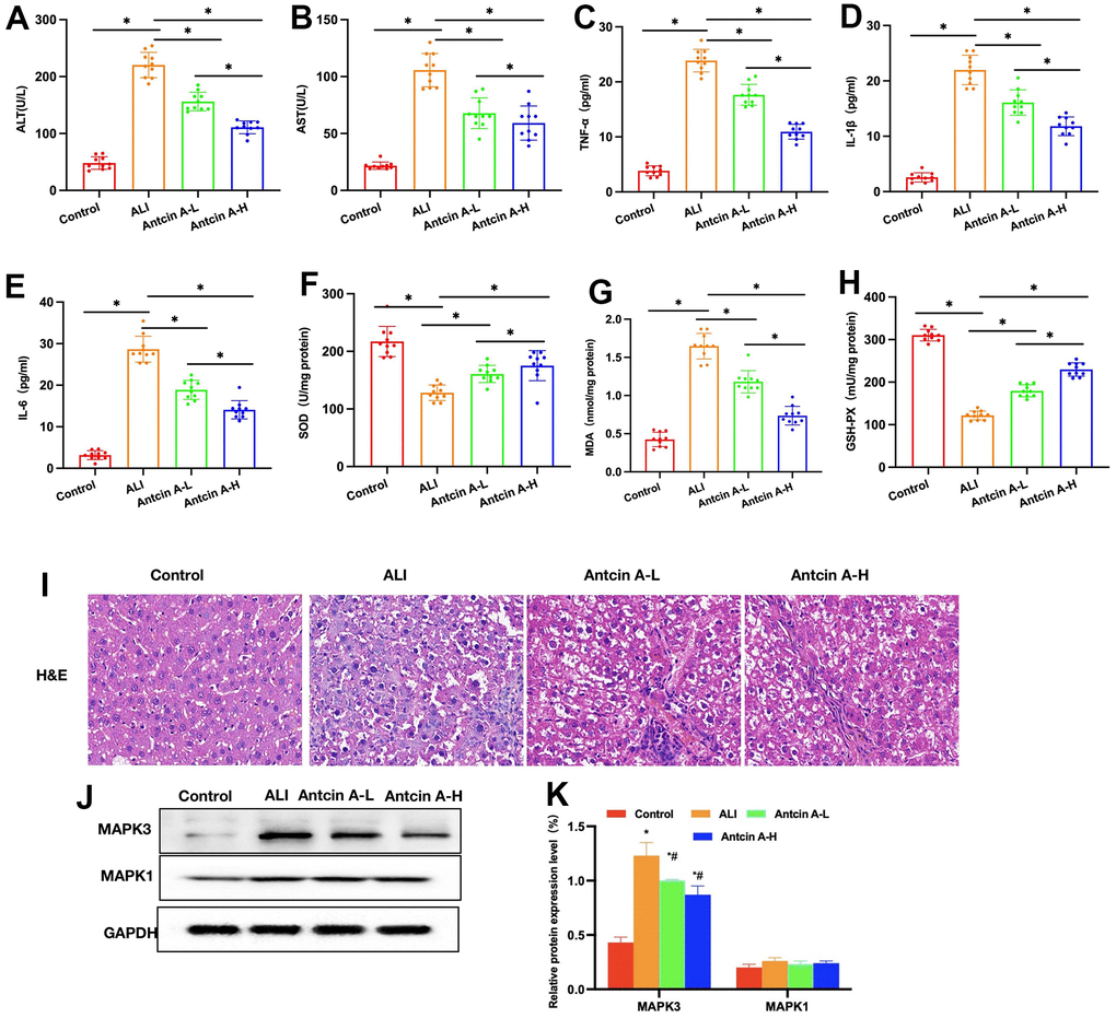 LPS and D-GlaN treatment induced ALI in mice, ALT mice had elevated ALT and AST levels, up-regulated inflammatory factor levels (IL-6, IL-1β and TNF-α), decreased SOD and GSH-Px levels, whereas increased MDA expression, and the differences were significant compared with Control group. Antcin A treatment suppressed liver injury, decreased the ALT and AST levels (Figure 4A, 4B), reduced the expression of inflammatory factors (Figure 4C–4E), elevated SOD and GSH-Px levels, and decreased MDA level (Figure 4F–4H) dose-dependently, and the differences were significant relative to ALI group. H&E staining results indicated that, ALI group exhibited inflammation, edema and necrosis in liver tissues, with obvious liver cell injury, while no obvious injury was seen in Control group, and Antcin A reduced inflammatory response and cell injury in tissues (Figure 4I). Protein detection suggested that, Antcin A did not significantly affect MAPK1, but it reduced the expression of MAPK3 (Figure 4J, 4K).