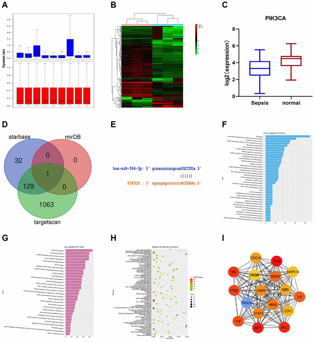 Paired-samples t-test was performed (|logFC|>2 and p < 0.05) to evaluate DEGs between normal group and sepsis group (Figure 1B). It was found in GSE154918 that the expression of PIK3CA was down-regulated in sepsis compared with that in normal samples (Figure 1C). The upstream miRNAs of PIK3CA were evaluated through miRDB, starBase and TargetScan, and the DEG of miR-506, a key regulator of PIK3CA, was obtained from the intersection (Figure 1D).