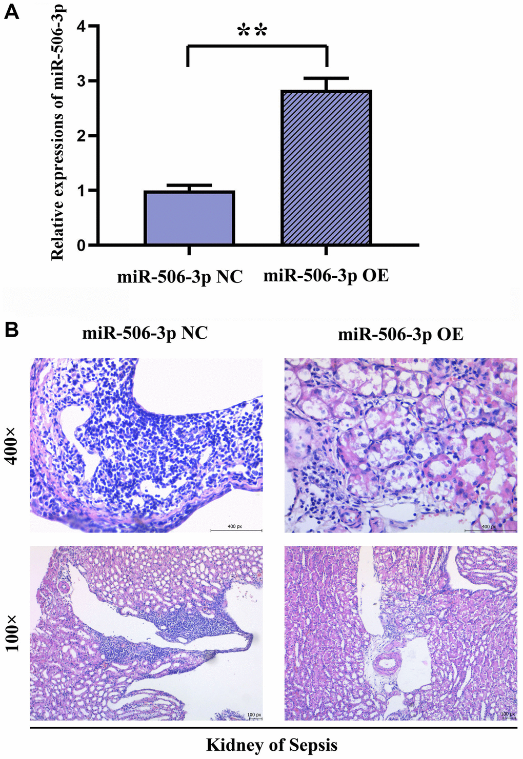 The apoptosis of renal tubular epithelial cells in kidney tissues was detected by TUNEL staining. The results showed that the apoptosis in kidney tissues was significantly weakened in sepsis miR-506-3p OE group compared with that in sepsis miR-506-3p OE NC group (p < 0.01), suggesting that overexpression of miR-506-3p can effectively reduce apoptosis in kidney tissues after SA-AKI (Figure 3A, 3B).