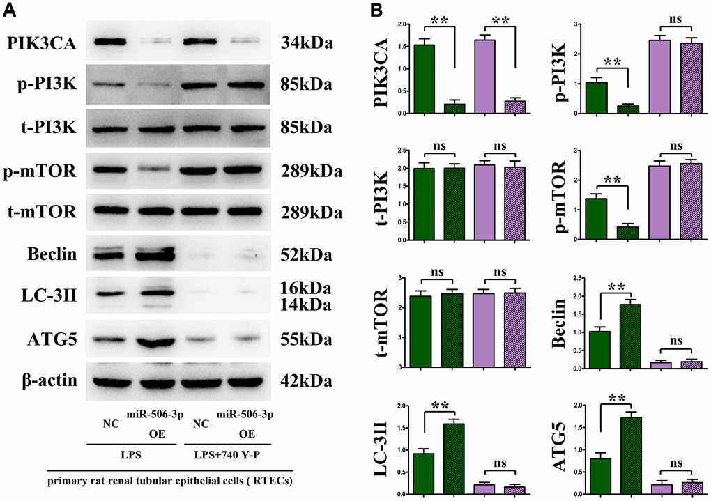 The results of in vivo and in vitro experiments manifested that overexpression of miR-506-3p decreased the expressions of PIK3CA, p-PI3K and p-mTOR, but increased the expressions of Beclin, LC-3II and ATG5. After 740Y-P was added, the expressions of p-PI3K, p-mTOR, Beclin, LC-3II and ATG5 had no significant changes, but the expression of PIK3CA declined in miR-506-3p OE+740Y-P group compared with those in miR-506-3p NC+740Y-P group (p < 0.01). The above results demonstrate that exogenous overexpression of miR-506-3p can regulate the expression of autophagy-related proteins through inhibiting the PI3K pathway, thereby enhancing the autophagy of renal tubular epithelial cells in sepsis. Besides, highly expressed miR-506-3p in model group could alleviate kidney tissue damage, mitochondrial morphological changes and apoptosis, and increase the number of autophagosomes in renal tubular epithelial cells. It can be seen that miR-506-3p may enhance autophagy of renal tubular epithelial cells. The above findings indicate that overexpression of miR-506-3p in normal cells has no impact on the PI3K pathway, but overexpression of miR-506-3p in SA-AKI model can activate autophagy-related proteins through inhibiting the PI3K pathway, thereby enhancing autophagy of renal tubular epithelial cells in sepsis.