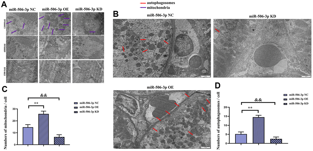 The successful miR-506-3p transfection was detected by real-time fluorescence quantitative PCR. After HE staining, it was observed under the electron microscope that there were no significant changes in the pathology of kidney tissues, autophagy of renal tubular epithelial cells and mitochondrial morphology in miR-506-3p OE NC group, miR-506-3p OE group and sepsis miR-506-3p OE NC group. Compared with those in sepsis miR-506-3p OE NC group, the kidney tissue damage, mitochondrial morphological changes and apoptosis were significantly alleviated, while the number of autophagosomes in renal tubular epithelial cells was significantly increased in sepsis miR-506-3p OE group (Figure 2).