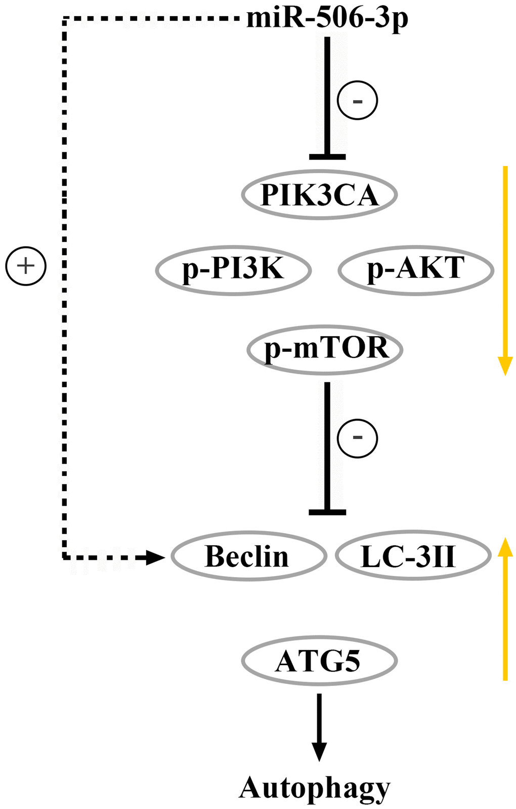 Overexpression of miR-506-3p decreased the expressions of PI3K signaling pathway proteins PIK3CA, PI3K and mTOR, but increased the expressions of autophagy proteins Beclin, LC-3II and ATG5