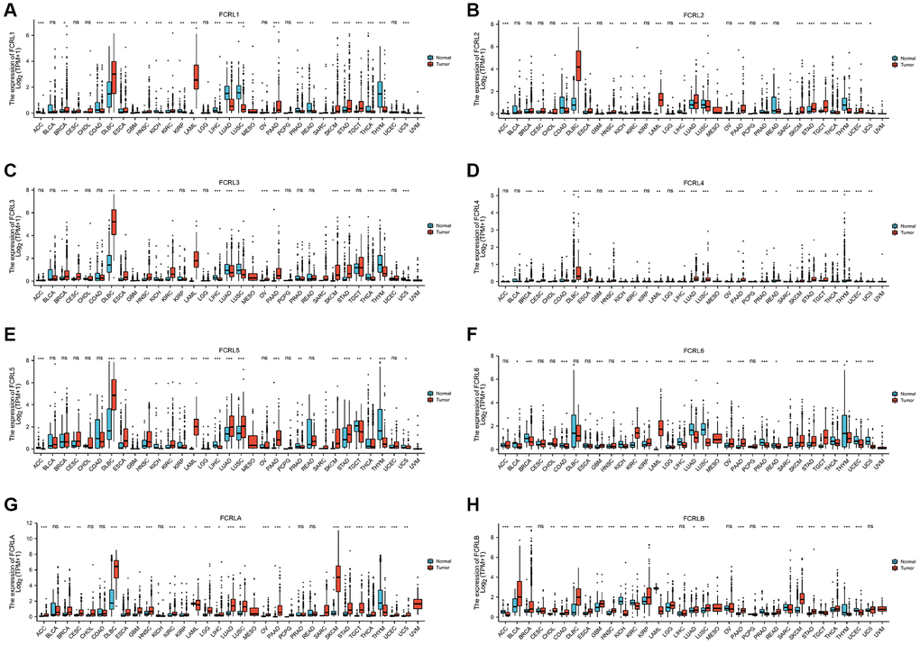 A total of 15776 individuals from The Cancer Genome Atlas (TCGA) and Genotype-Tissue Expression (GTEx) were included in the unpaired sample comparison. FCRL1, FCRL2, and FCRL4 are low in both most tumors and normal tissues. As Figure 1A showed, FCRL1 was expressed significantly lower in ACC, COAD, KICH, KIRC, KIRP, LIHC, LUAD, LUSC, PRAD, READ, THCA, THYM, and UCS tumor tissue than in normal tissue and significantly higher in BRCA, DLBC, ESCA, GBM, HNSC, LAML, PAAD, SKCM, STAD, and TGCT than in normal tissue. FCRL2 expression was significantly higher in LUAD, DLBC, ESCA, KIRC, HNSC, LAML, PAAD, SKCM, STAD, TGCT, and UCEC but significantly lower in ACC, COAD, KICH, KIRP, LIHC, LUSC, PRAD, THCA, THYM, UCS compared to normal tissue (Figure 1B). FCRL3 expression was significantly higher in BRCA, CESC, DLBC, ESCA, GBM, HNSC, KIRC, LAML, OV, PAAD, SKCM, and STAD but significantly lower in KICH, LIHC, LUAD, LUSC, THCA, THYM, UCS compared to normal tissue (Figure 1C). FCRL4 expression was significantly higher in BRCA, CESC, COAD, DLBC, ESCA, LUSC, HNSC, LUAD, PAAD, READ, STAD, TGCT, THCA, THYM, UCEC but significantly lower in KICH, KIRC, LAML, LIHC, OV, PRAD, SKCM, UCS compared to normal tissue (Figure 1D). FCRL5 expression was significantly higher in DLBC, ESCA, HNSC, KIRC, LAML, LUAD, LUSC, PAAD, READ, SKCM, and STAD but significantly lower in ACC, GBM, KICH, KIRP, LGG, LIHC, PRAD, TGCT, THCA, THYM, UCS compared to normal tissue (Figure 1E). FCRL6 expression was significantly higher in GBM, KIRC, KIRP, LAML, OV, PAAD, SKCM, STAD, and TGCT but significantly lower in BRCA, BLCA, COAD, KICH, LGG, LIHC, LUAD, LUSC, PRAD, READ, THCA, THYM, UCS, UCEC compared to normal tissue (Figure 1F). FCRLA expression was significantly higher in ACC, CESC, BRCA, DLBC, ESCA, GBM, HNSC, KIRC, KIRP, LGG, LIHC, LUAD, LUSC, OV, PAAD, PCPG, SKCM, STAD, TGCT, THCA, UCEC, UCS but significantly lower in COAD, KICH, LAML, THYM compared to normal tissue (Figure 1G). FCRLB expression was significantly higher in BLCA, BRCA, CHOL, DLBC, ESCA, GBM, HNSC, KIRP, LGG, LUAD, LUSC, PAAD, READ, SKCM, STAD, THCA but significantly lower in ACC, COAD, KICH, KIRC, LAML, LIHC, PRAD, TGCT, UCEC, THYM compared to normal tissue (Figure 1H). The expression of FCRL family genes in MESO cannot be compared with normal tissues due to the lack of data in the corresponding normal tissues.