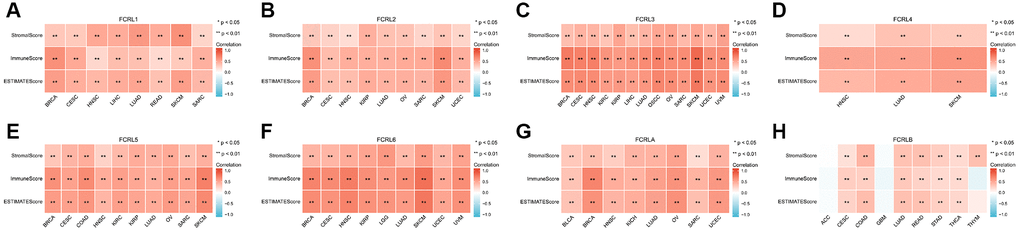 In our study, we analyzed the correlation between the expression of FCRL family genes and Stromalscore, Immunescore, and ESTIMATEscore in multiple types of cancer. The expression of FCRL family genes exerts a notable impact on the OS of these tumors. Our results indicated that FCRL family genes, with the exception of FCRLB, exhibited a significant and positive correlation with the aforementioned scores in the examined tumors (Figure 10A–10G). However, in Adrenocortical carcinoma (ACC) and Glioblastoma multiforme (GBM), the correlations between FCRLB gene expression and Stromalscore, Immunescore, and ESTIMATE score were found to be insignificant. Similarly, in Thymoma (THYM), the correlations between FCRLB gene expression and Immunescore and ESTIMATE score were also insignificant (Figure 10H).