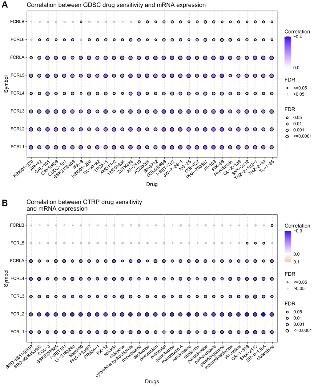 In this study, we investigated the relationship between FCRL family gene expression and the drug IC50 using the GSCALite online platform. IC50 data from two drug databases, Genomics of Drug Sensitivity in Cancer (GDSC) and Cancer Therapeutics Response Portal (CTRP), were utilized in the analysis. Spearman correlation analysis was performed to examine the expression of each FCRL family gene in pan-cancer and its association with different small molecule/drug sensitivity (IC50). The drugs obtained were ranked based on their relevance to the FCRL family using Spearman correlation analysis of the database.