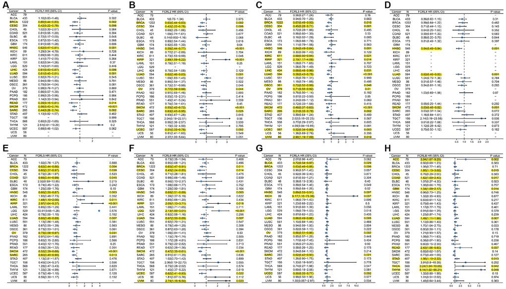 The “survival” package was used to conduct Kaplan–Meier (K-M) analysis. The OS between the high- and low-FCRL family gene expression groups were compared in 34 cancers. The p-value was determined by Cox regression analysis. The forest plots plotted the Hazard ratio (HR), 95% Confidence Interval (CI), and p-value of survival curves were calculated and visualized by “survminer” and “ggplot2” (v3.3.3) package.
