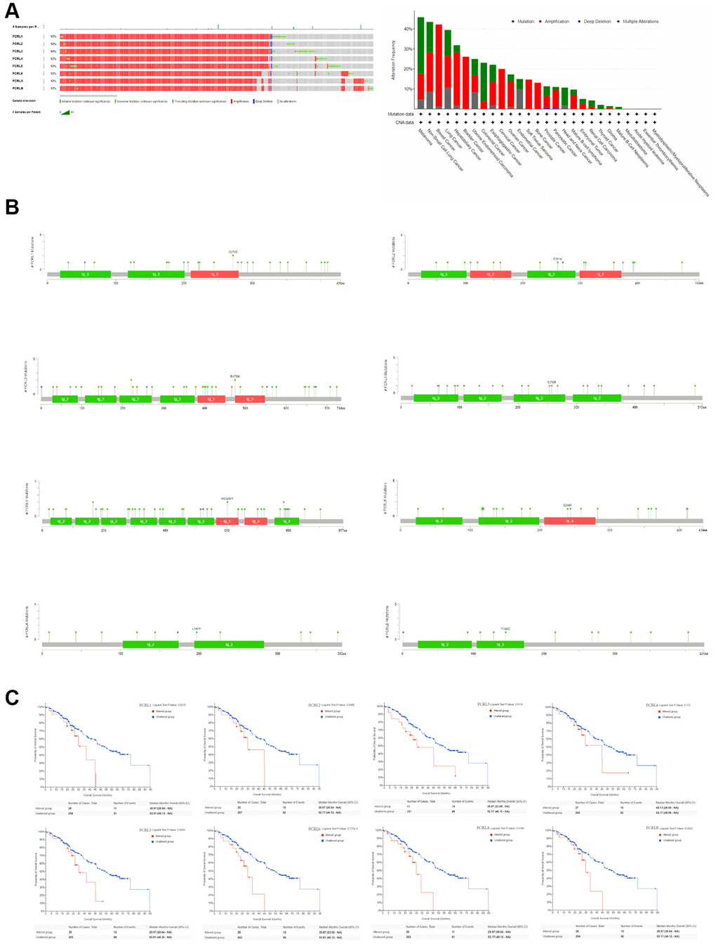 The genetic alterations affecting the expression of FCRL family genes in pan-cancer were examined using the cBioPortal web tool. The analysis comprised 2922 samples from the ICGC/TCGA databases. The most frequently occurring genetic modifications were amplification and mutation. The frequency of genetic variants was 13%, 13%, 14%, 13%, 13%, 13%, 13%, and 13% in FCRL1-6, A, and B, respectively. The frequency of alterations in FCRL family genes exceeded 20% in melanoma, non-small cell lung cancer, breast cancer, lung cancer, hepatobiliary cancer, bladder cancer, endometrial cancer, colorectal cancer, and esophageal cancer, and the main types of alterations were mutations and amplifications (Figure 3A). The specific alteration sites between amino acids for each FCRL family gene were illustrated in Figure 3B. The unaltered group of FCRL1-3, 5, 6, and A had better OS compared to the altered group (Figure 3C).
