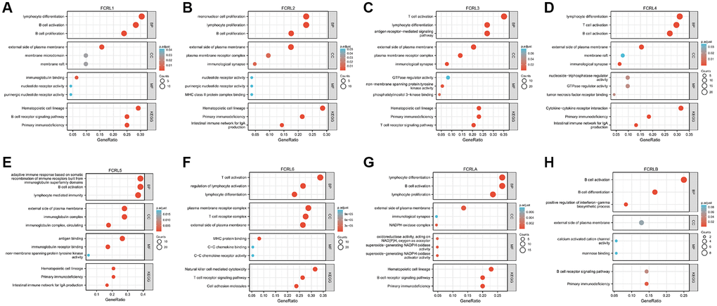 The top 100 mRNA that interact closely with each FCRL family gene were used for GO/KEGG enrichment analysis. Three kinds of RNA function were identified: the biological process (BP), molecular function (MF), and cellular component (CC). The common BP terms were B cell proliferation, lymphocyte proliferation, lymphocyte differentiation, T cell activation, and B cell activation; the T cell activation was also shown in BP of FCRL3, 4, and 6. The common CC terms were external side of plasma membrane, membrane raft, and immunological synapse; the MF terms were mostly associated with nucleotide receptor activation for FCRL1 and 2 and GTPase regulator activity for FCRL3, 4. Antigen and immunoglobulin receptor binding were MF terms associated with FCRL5. MFs that are closely related to FCRL6 are MHC protein binding, C-C chemokine binding, and C-C chemokine receptor activity. MF of FCRLA is associated with superoxide-generating NADPH oxidase activity. KEGG pathways associated with FCRL family genes included Hematopoietic cell lineage, primary immunodeficiency, intestinal immune network for IgA production, and T and B cell receptor signaling pathway. Notably, KEGG in FCRL6 is also associated with natural killer cell-mediated cytotoxicity (Figure 5A–5H).