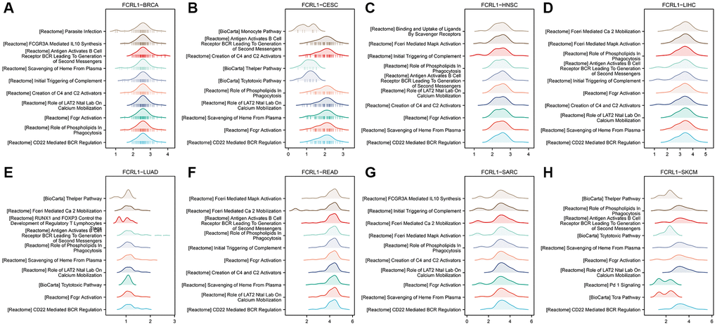 We performed GSEA for each FCRL family gene in cancers in which expression of FCRL family genes significantly affected OS. The top 10 enriched pathways of GSEA for FCRL1 in BRCA, CESC, HNSC, LIHC, LUAD, READ, SKCM, and SARC were shown in Figure 6A–6H. The enriched terms that CD22 mediated B cell receptor (BCR) regulation, Fcγ receptors activation, role of LAT2, NTAL, and LAB on calcium mobilization, scavenging of heme from plasma, creation of C4 and C2 activators, antigen activates BCR leading to generation of second messengers, role of phospholipid in phagocytosis had shown in 5 cancers and initial triggering of complement had shown in 4 cancers. The top 10 enriched terms of other FCRL family genes were shown in Supplementary Table 1.