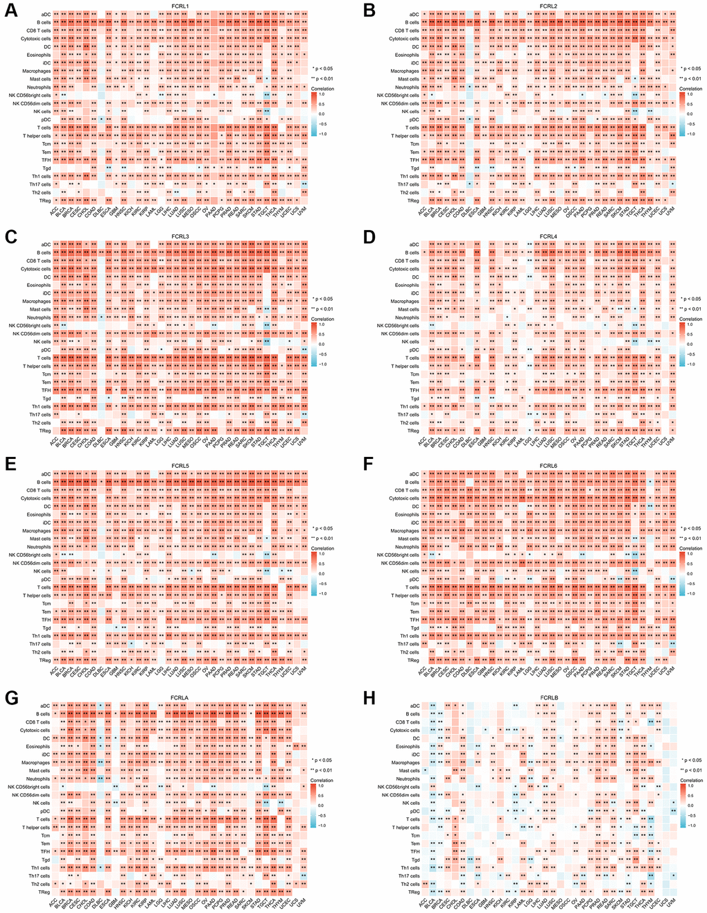 The expression of FCRL1-6 and A exhibited strong positive correlations with most TILs in various tumors, with the exception of the marker of natural killer CD56bright cells. This association was particularly prominent in the markers of B and T cells. However, in diffuse large B-cell lymphoma (DLBC), FCRL1-5 and A gene expression did not exhibit significant correlations with markers of other TILs, except for B cells, which demonstrated a strong positive correlation. Conversely, FCRL6 expression showed no significant correlation with B cells in DLBC but instead exhibited a strong positive correlation with several other markers of TILs (Figure 7A–7H).