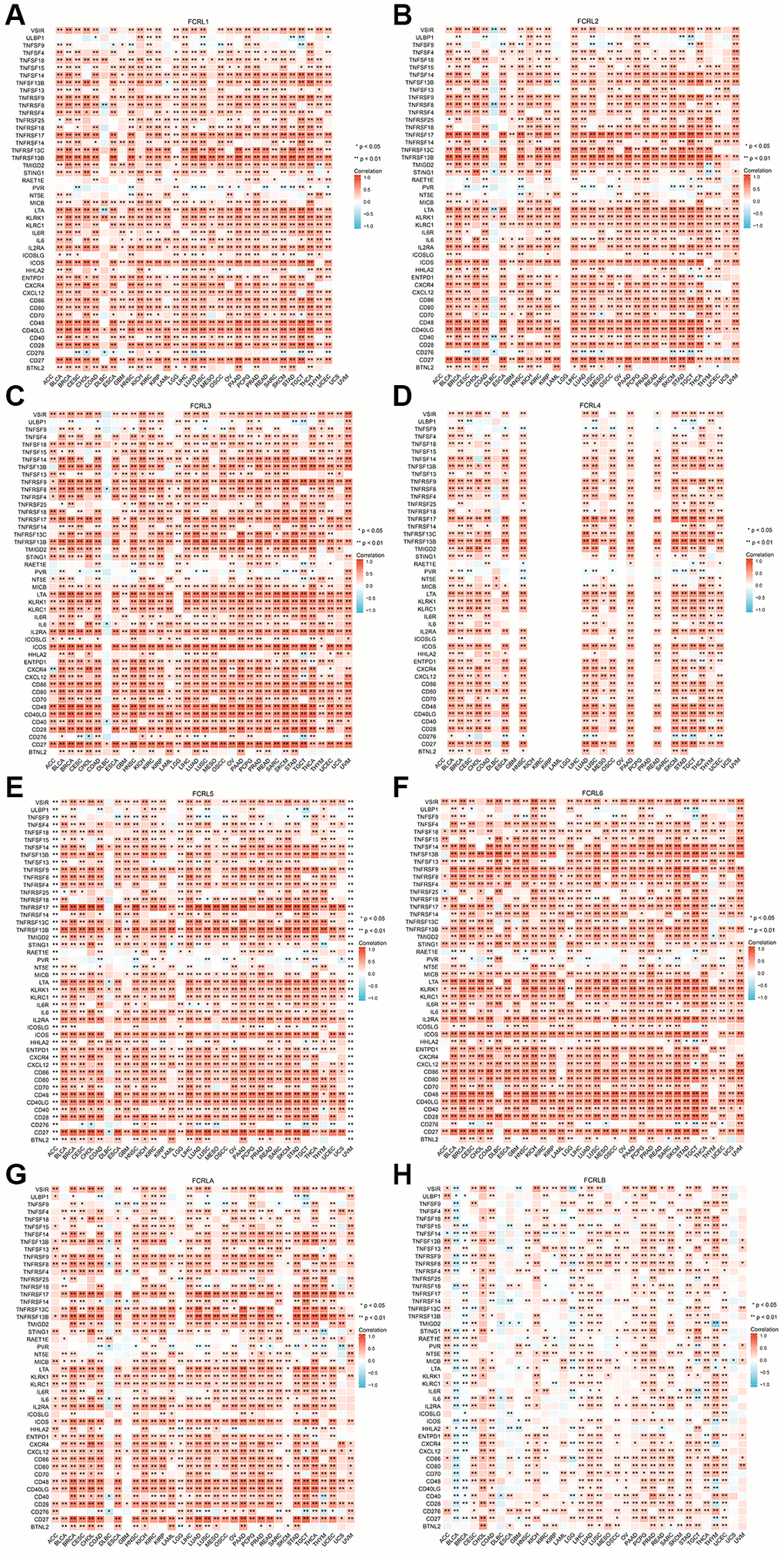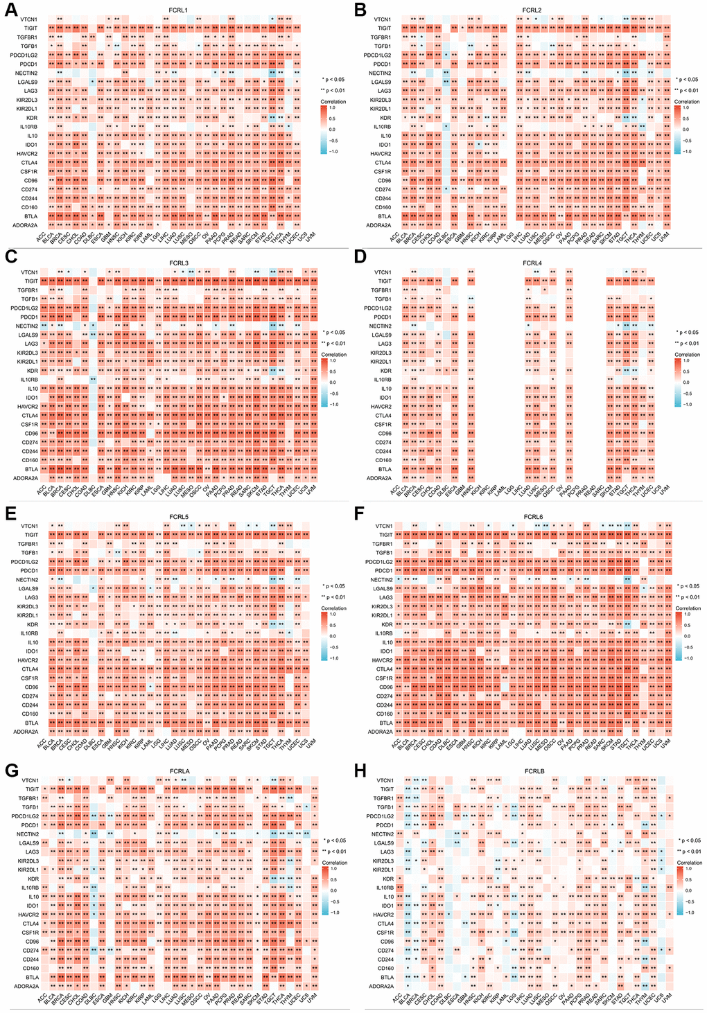 At the level of immunostimulators, the expression of FCRL1-6 and A demonstrated strong positive correlations with most markers of immunostimulators, with the exception of ULBP1, TNFSF9, RAET1E, PVR, ICOSLG, and CD276 (Figure 8A–8H). Similarly, the expression of FCRL1-6 and A in most tumors demonstrated strong positive correlations with most markers of immunoinhibitors, except for VTCN1, TGFBR1, TGFB1, NECTIN2, and IL10RB (Figure 9A–9H). Correlations between FCRL4 and markers of immunostimulators and immunoinhibitors for a number of tumours including GBM, KICH, KIRC, KIRP, LAML, LGG, LIHC, OV, PCPG, PRAD, READ, SARC, UCS, and UVM could not be analysed due to missing data in the database.
