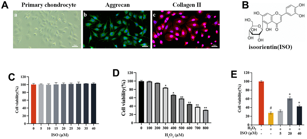 A study found that H2O2 causes in vitro inflammation, which could be useful in simulating OA [24]. Eight thousand cells/well of chondrocytes were seeded into a 96-well plate at 12 h. Afterward, chondrocytes were exposed to ISO (5, 20, and 40 μM) for 12 h. The cell media was then treated with 500 μM H2O2 and allowed to grow for 4 hours. After 30 min of incubation with the CCK-8 solution in each well, the absorbance at 450 nm was measured using a microplate reader (Thermo Varioskan LUX, US).