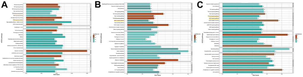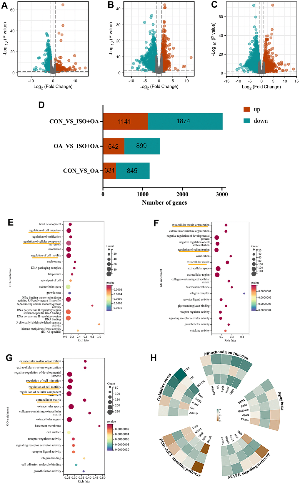 After RNA-Seq and bioinformatic analysis, the 542 upregulated genes and the 899 downregulated genes were conducted to identify the mechanism of ISO therapy in H2O2-induced chondrocytes. A single RNA-seq library represented the transcriptome of each sample. Red denotes upregulated genes, while green denotes downregulated genes, as presented in Figure 2A–2C. The gene change values are shown in Figure 2D. In the model group, a total of 3,015 DEGs were verified, with 1,141 upregulated and 1,874 downregulated compared to the normal group. After ISO pretreatment, 542 genes were upregulated and 899 genes were downregulated in comparison to the OA group. GO analysis of DEGs revealed that “regulation of cell migration”, “regulation of cell component movement”, “regulation of cell motility” and “extracellular matrix organization” were the most significantly altered GO terms (Figure 2E–2G). Among these changes, we summarized the functions of the main changes as “oxidative stress” and “mitochondrion function.” Furthermore, KEGG pathway enrichment analysis (Figure 3A–3C) revealed pathways associated with “apoptosis,” “PI3K/Akt signaling pathway,” and “MAPK signaling pathway.” The genetic changes associated with the aforementioned terms are depicted in Figure 2H.
