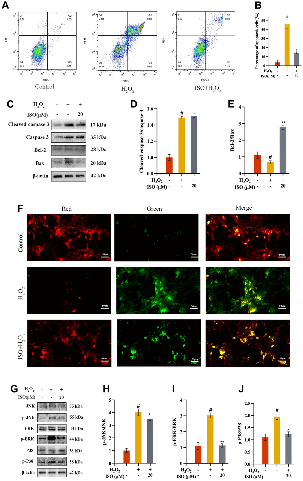 Assessment of MMP was used as an indicator of early apoptosis. MMP, caused by an excess of ROS in the mitochondria, destroys DNA and the mitochondrial membrane, resulting in mitochondrial dysfunction [25]. Therefore, MMP was used to assess the protective capacity of ISO against apoptosis by H2O2 in chondrocytes (Figure 4F). Normal chondrocytes with high MMP fluoresced red after staining with JC-1. However, there was a decrease in membrane potential in the OA group, as evidenced by green fluorescence. The fluorescence returned to almost normal levels in the ISO-pretreated group.