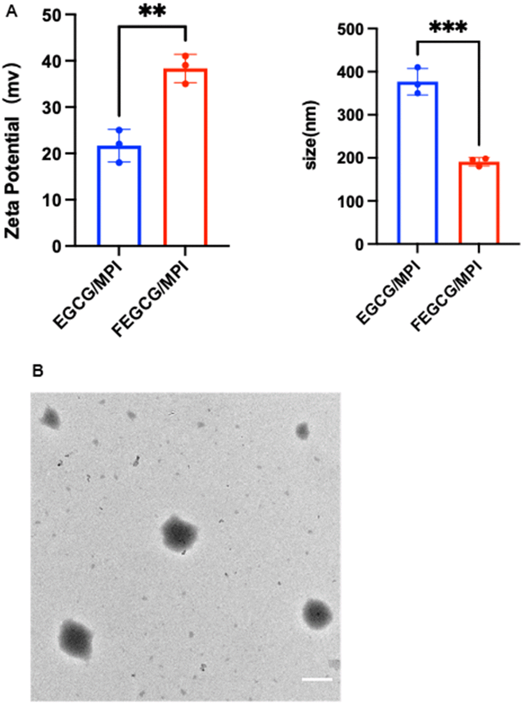 FEGCG and MPI are bonded by hydrogen bond. As expected, the NPs could be self-assembled. FEGCG/MPI or EGCG/MPI, and their particle size was about 299, 499 nm, Zeta potential was 21, 38 mv (Figure 1A). Transmission electron microscope (TEM) results confirmed the successful formation of FEGCG/MPI (Figure 1B). These results demonstrated that FEGCG/MPI system has the potential to deliver biomolecules ranging from small molecule drugs to larger macromolecules.
