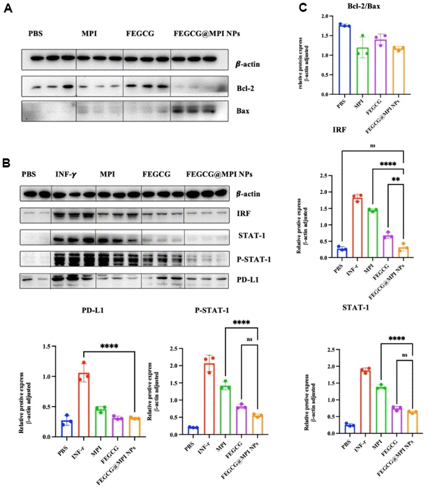 Bcl-2 family proteins are major regulators of apoptosis in health and disease. In the present study, we evaluated the expression of Bax and Bcl-2 genes in hepatocellular carcinoma to investigate the regulatory effect of FEGCG and MPI on the Bcl-2 family. Bcl-2 protein family is a special family. 25 homologous proteins of Bcl-2 family have been found. Bad and Bax promote apoptosis, while Bcl-2 and Bcl-2 inhibit apoptosis. It can be seen from (Figure 3A) that FEGCG can regulate the increase of Bax and the decrease of Bcl-2, and melittin can significantly reduce the protein content of Bcl-2. From the study, it can be concluded that mixed administration can significantly reduce the protein content of Bcl-2 and increase the protein content of Bad. Programmed death ligand 1 (PD-L1) is the ligand of programmed death 1 (PD-1) and an important immune checkpoint protein, which is responsible for negatively regulating the stability and integrity of T cell immune function. However, the response rate of patients to current anti PD-1 or anti PD-L1 treatment is still very low, and many initial responders eventually develop drug resistance to these treatments. FEGCG, the raw material of this study, can reduce the content of PD-L1 through transcriptional level, thereby effectively inhibiting the growth of liver cancer, thereby reducing the expression of PD-L1. At the same time, it can be seen from (Figure 3B) that mixed administration can enhance the effect of FEGCG in reducing PD-L1, and cooperate with MPI to play an anti-tumor role.