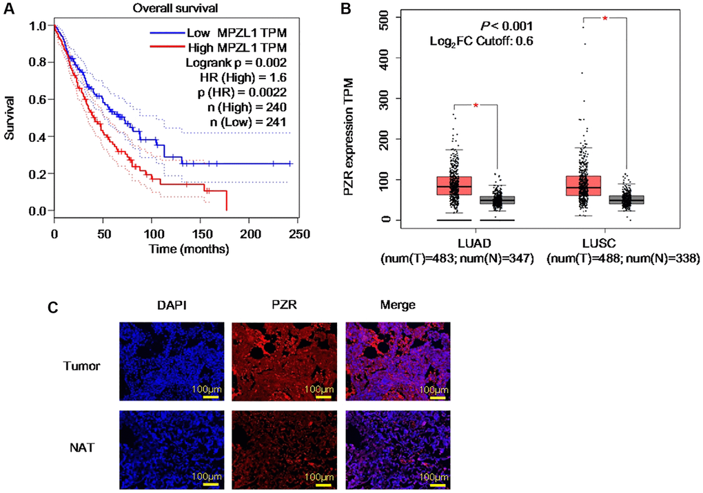 PZR was reported to be highly expressed in human advanced gallbladder carcinoma, ovarian cancer, and hepatocellular carcinoma and to play an important role in tumor development [14, 19, 20]. As a widely expressed protein, we thought that it may be involved in NSCLC, the major form of lung cancer and the deadliest worldwide [21]. By analyzing the TCGA database via the Gene Expression Profiling Interactive Analysis (GEPIA) portal, we found that high PZR expression is correlated with unfavorable prognosis with a hazards ratio of 1.6 and log rank P value of 0.002 (Figure 1A). Further analyses of the TCGA and GTEx gene expression databases revealed that PZR is overexpressed in both lung adenocarcinoma (LUAD) and lung squamous cell carcinoma (LUSC) in comparison with normal control lung tissues (Figure 1B). To verify the expression of PZR, we performed immunofluorescence staining of 3 pairs of matched malignant lung adenocarcinoma cancer tissues and adjacent normal tissues. The data demonstrated clearly higher levels of PZR in cancer cells (Figure 1C). Taken together, these findings suggest that PZR may play an important role in lung cancer development.
