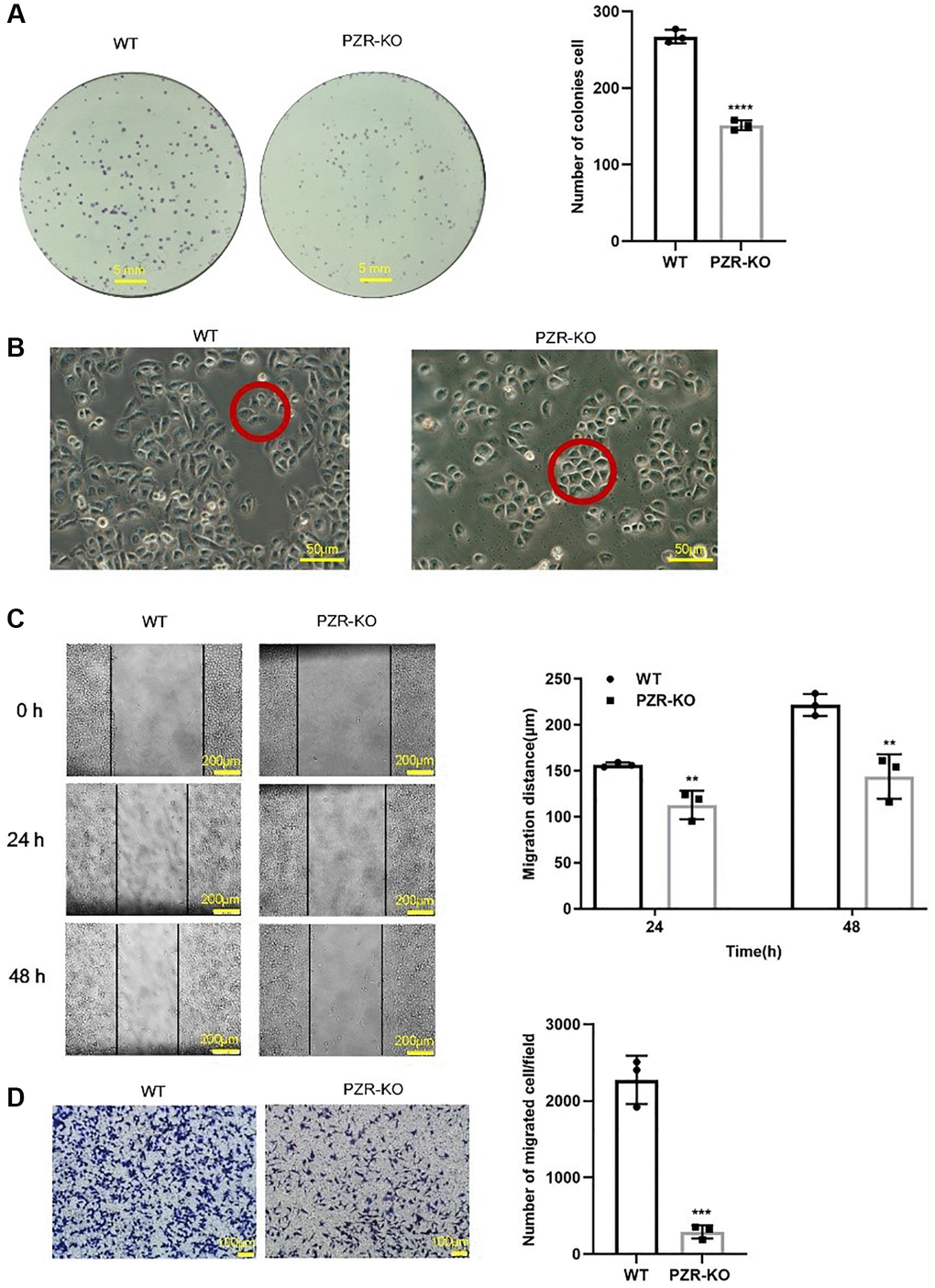 To investigate the effects of PZR knockout on cell proliferation, colony formation assays were performed. The data demonstrated that knockout of PZR reduced colony-forming ability of SPC-A1 cells by 50% (Figure 3A). We also noticed a trivial change in the morphology of PZR-knockout SPC-A1 cells grown in monolayer cell culture. While the wild type cells have an elongated shape and spread out well, the PZR-knockout SPC-A1 cells are somewhat cobblestone-like with close cell-cell contacts (Figure 3B). This may be caused by reduced cell migration ability. To find out if this is the case, we employed wound healing assays. As shown in Figure 3C, knockout of PZR decreased the migration rate of SPC-A1 cells. Impaired cell migration may also affect cancer cell invasion because migration is a prerequisite for invasion. Indeed, cell invasion assays with Matrigel matrix-coated Transwell chambers demonstrated that PZR-KO cells had much lower invasion capacity than wild-type cells (Figure 3D).