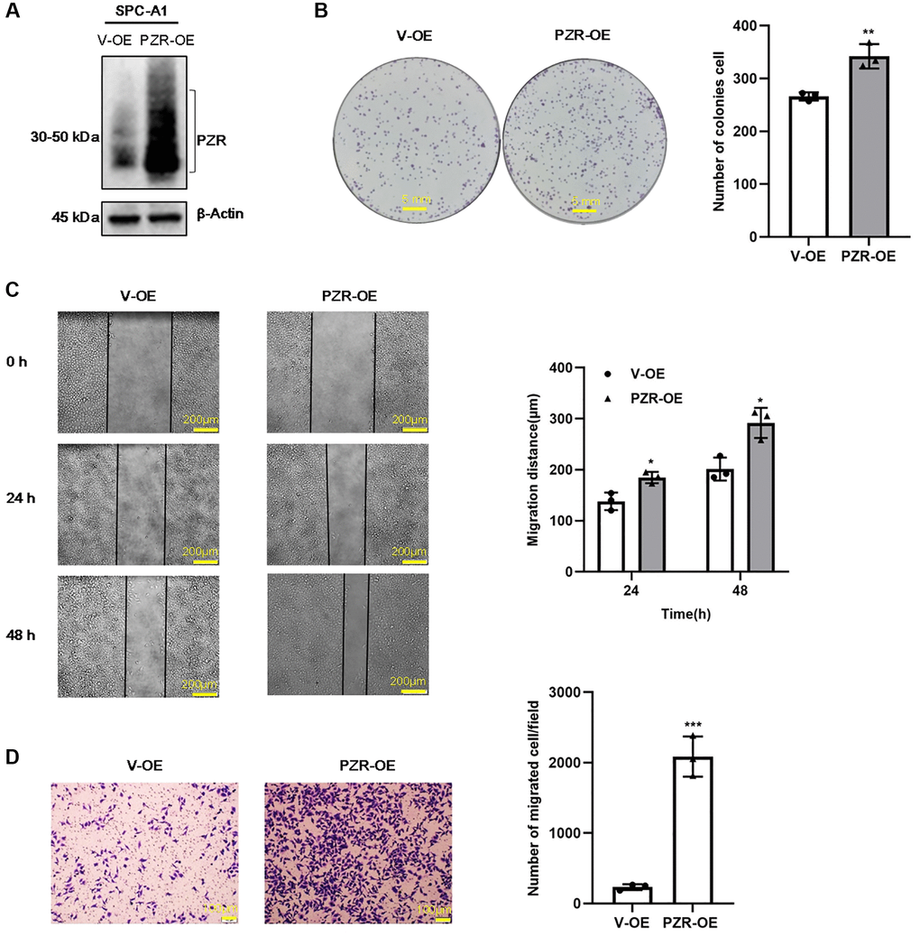 To verify further the effects of PZR on cellular activities, we overexpressed PZR in SPC-A1 cells by using recombinant lentivirus carrying PZR and selected PZR-overexpressing stable cell lines. Figure 4A shows marked overexpression of PZR in a typical PZR-OE cell line in comparison with the cells c control cells (V-OE). We further carried out colony-forming, migration, and invasion assays as described for the PZR-OE cells (Figure 4B–4D). In contrast to the effects observed with V-OE cells, overexpression of PZR significantly increased cell proliferation, migration, and invasion. This provides further evidence that PZR has an important role in proliferation, migration, and invasion of SPC-A1 cells.