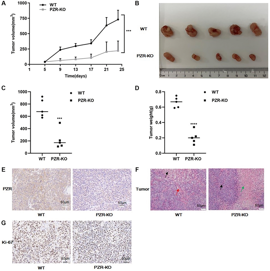 We further employed immunodeficient NYG mice to test tumor formation ability of PZR-KO SPC-A1 cells in vivo. Generated by knocking out the expressions of Prkdc and IL2rg in NOD mice using the CRISPR genome editing technique, these mice lack T, B, and NK cells and are ideal for engraftment of human cancer cells. We subcutaneously implanted wild-type and PZR-KO SPC-A1 cells each in 5 NYG mice. Tumor development was followed for 24 days before the termination of the mice for endpoint experiments. Both wild-type and PZR-knockout SPC-A1 cells formed measurable tumors on the 5th day but the PZR-knockout cells gave rise to slower tumor growth (Figure 5A). In the end, the difference in tumor sizes was dramatic (Figure 5B). The average volume and weight of tumors from PZR-knockout SPC-A1 cells were only 221 mm3 and 0.2 g, respectively, while those from the wild type cells were 721 mm3 and 0.68 g, respectively (Figure 5C, 5D). The data clearly demonstrated that loss of PZR suppressed the growth of SPC-A1 cells in vivo, which agrees with the in vitro cell growth data described above (Figure 3A). We further performed immunohistochemical staining of tumor tissue sections. In line with expectations, PZR staining is essentially absent in tumors formed by PZR-KO SPC-A1 cells (Figure 5E). The H/E staining revealed that the PZR-KO tumors had many necrotic cells and lacked blood vessels and interstitial extracellular matrix (Figure 5F). For further assessment of tumor cell aggressiveness, we performed Ki67 staining. The data shown in Figure 5G illustrated a much lower percentage of positive cells in tumor formed by PZR-KO SPC-A1 cells.