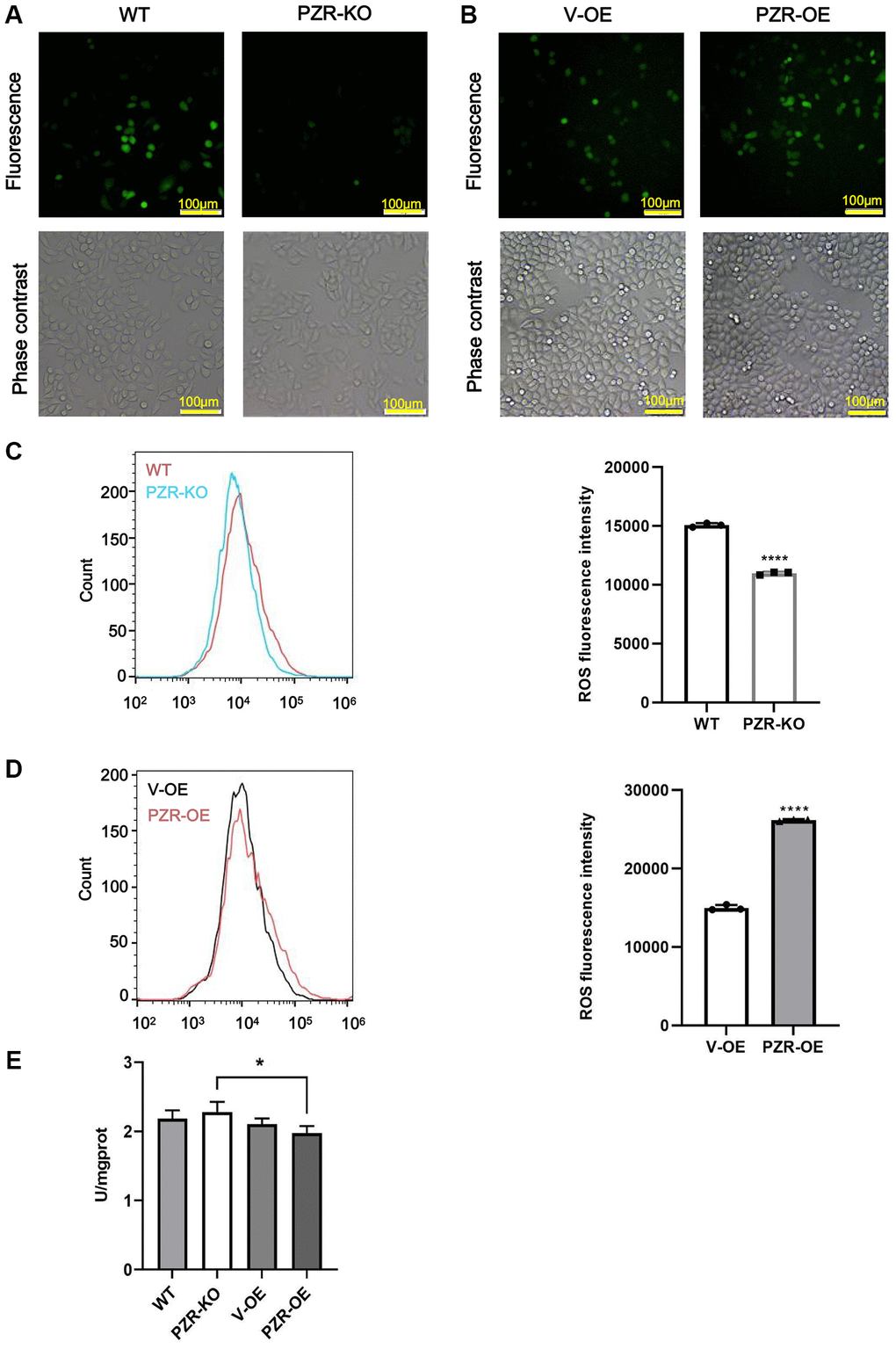 Previous studies have demonstrated that SHP-2 is highly susceptible to inactivation by ROS [7, 8]. By serving as a substrate and regulatory anchor protein of SHP-2, PZR may also be involved in cellular responses to oxidation stress. Notably, by performing DCFH-DA assays to measure intracellular ROS, we found that knockout of PZR significantly attenuated ROS generation in SPC-A1 while overexpression of PZR had the opposite effects as demonstrated by the results of fluorescence microscopic and flow cytometric analyses (Figure 7A–7D). The data suggest that PZR plays a role in regulating oxidation stress, which may be partly responsible for its tumor-promoting activities. Total superoxide dismutase (T-SOD) activity was assayed using the xanthine/xanthine oxidase method based on the production of O2− anions. As shown in Figure 7E, the activity of T-SOD enzyme significantly decreased after overexpression of PZR compared with knockout of PZR.